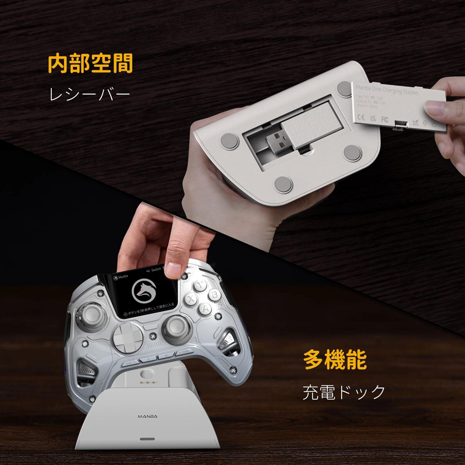【パッケージ内容】パッケージ内容:ゲームパッド×1、交換用スティック1組、USB Bluetoothレシーバー×1(充電クレードル底部の内側に配置)、Type-Cケーブル×1、充電クレードル×1、取扱説明書×1。 商品についてご不明な点、初期不良や自然故障など、ご使用中に問題がございましたら、弊社カスタマーサポートへお問い合わせ下さい。【コントローラー本体の重量は295g前後、誤差は5g前後】