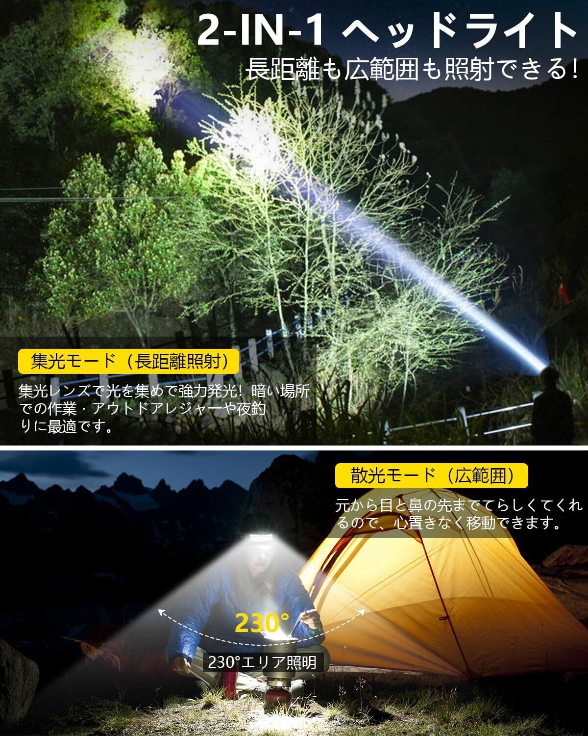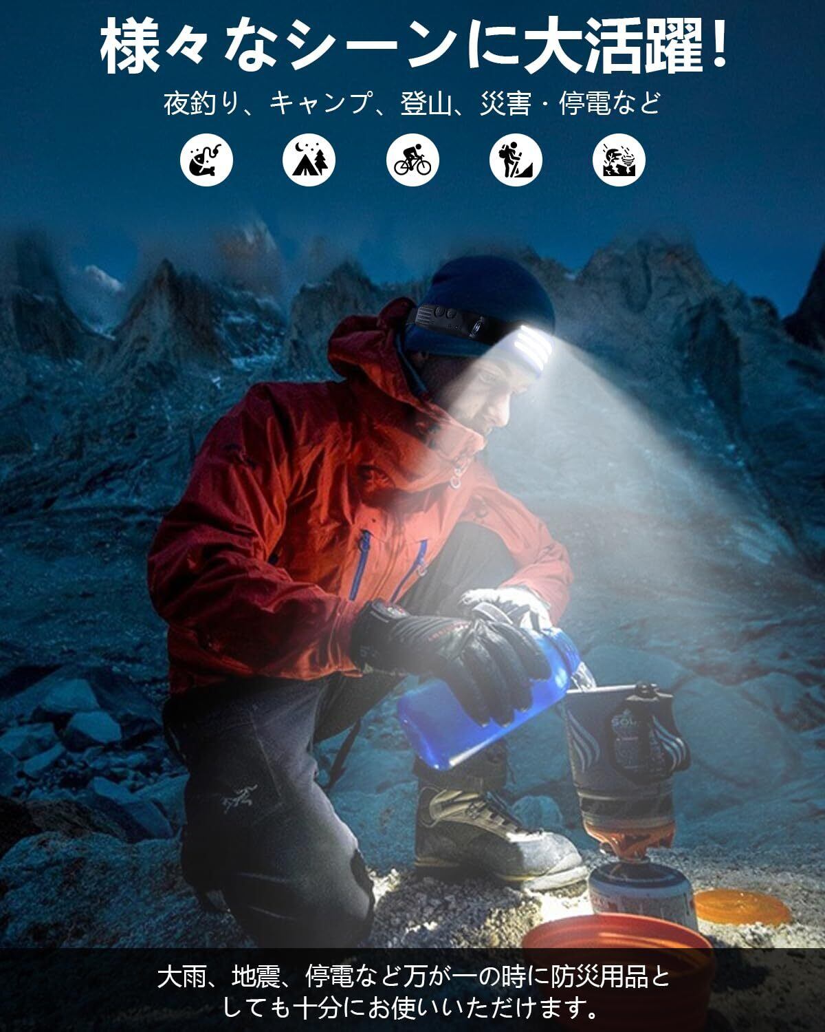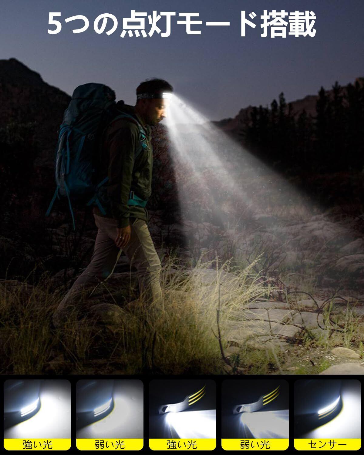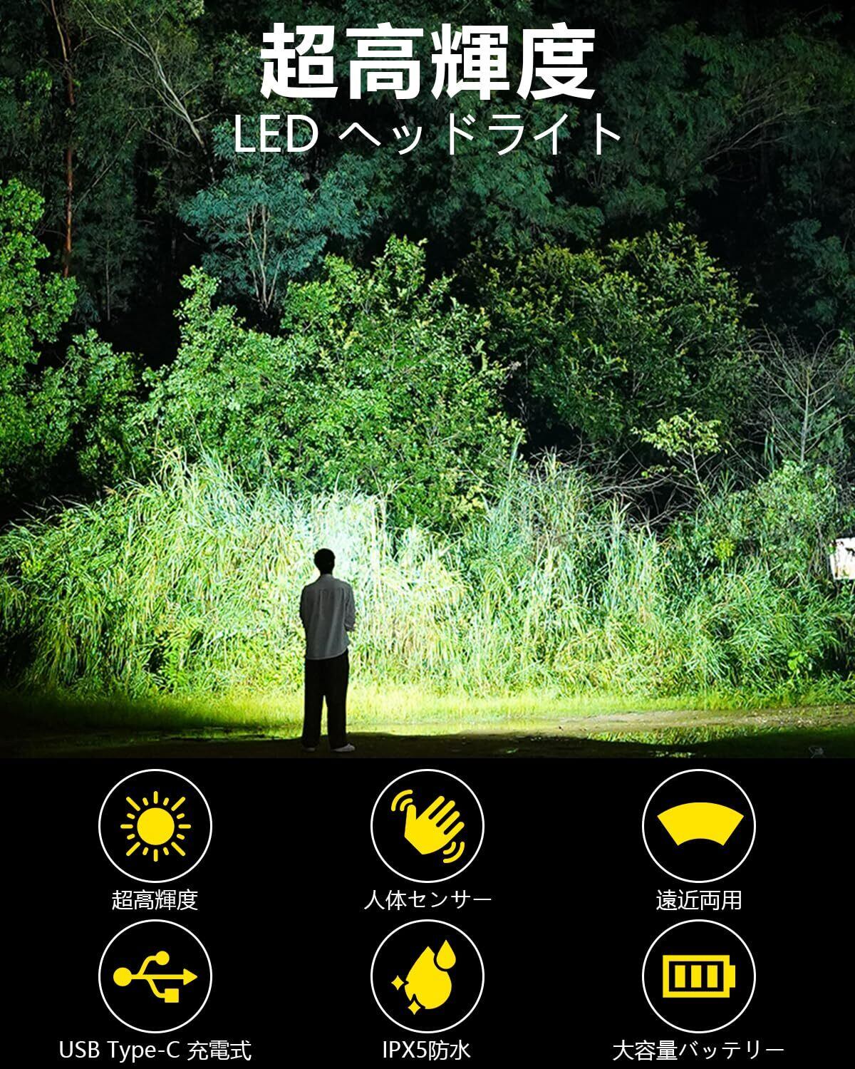 ヘッドライト 作業用ヘッドライト Type-C充電可能 人体センサ一搭載 2000mAh 6倍高輝度アウトドアヘッドランプ 230°広角照明 集光 防水防塵 8時間連続使用可能 キャンプ 登山 散歩 釣り 作業 夜釣り 停電用 防災用 超軽量 最適