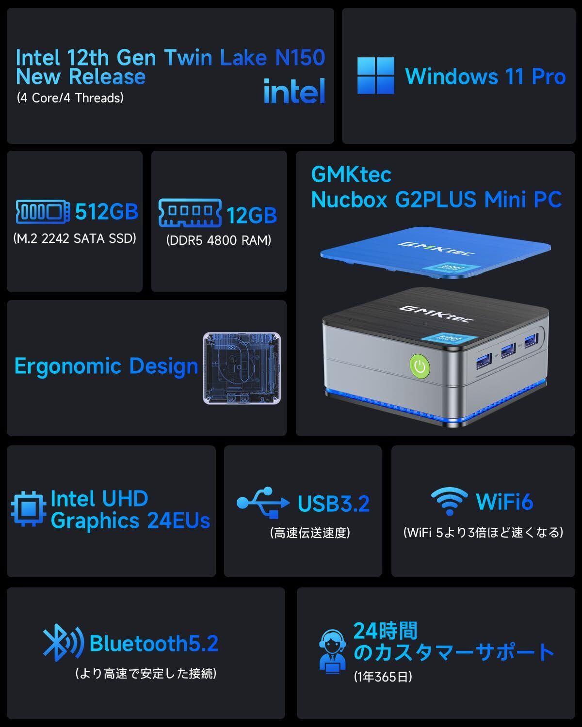 【第12世代Core-N150・Windows11 ProミニPC登場】 GMKtec-G2Plusは最新の第12世代のインテルTwin Lake-N世代の-N150(最大周波数3.6GHz、4C/4T、6MBキャッシュ )プロセッサーを内蔵しており、メモリ/ストレージは12+512を標準搭載、高性能及び小型体積兼備の新型ミニパソコン新登場。