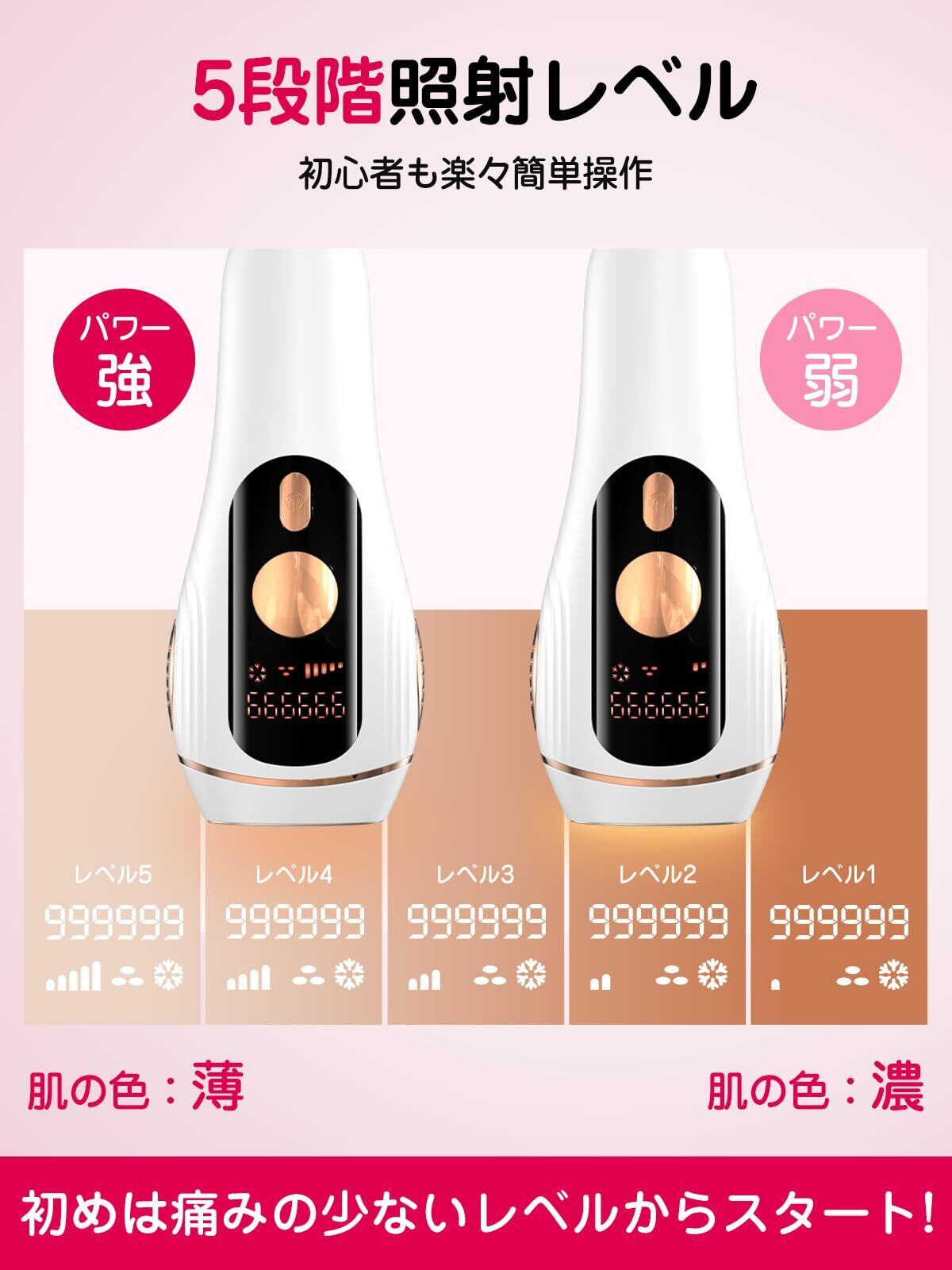 5段階調節・家庭用99万発照射:本脱毛器は5段階照射レベルがあります。説明書のカラーチャートを参照に、ご自分の肌色に合う照射レベルで使うのはより快適な脱毛体験を楽しめます。99万照射回数があり、一人での使用なら、40年以上が使用できます。家族や友人と一緒に使用することもでき、家族には1つで十分です。
