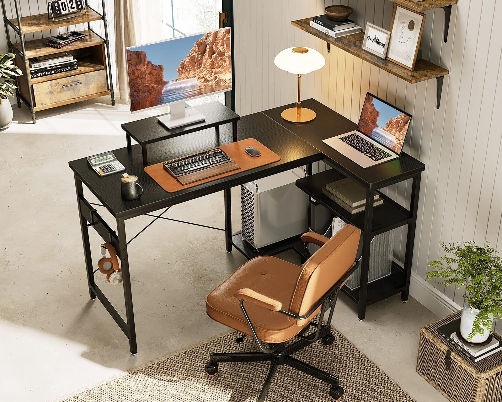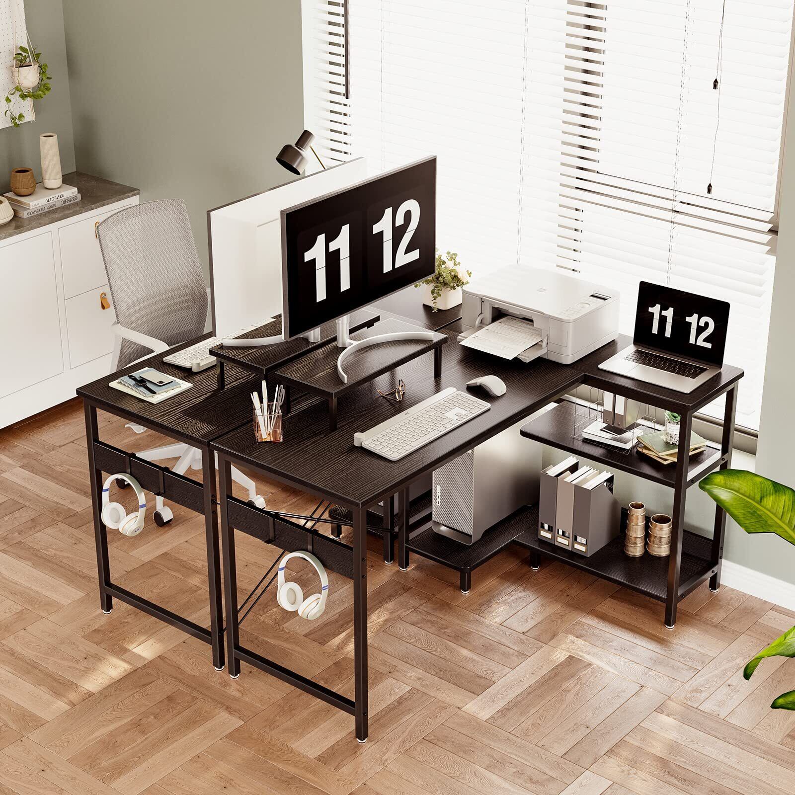 【ゲームと仕事両立】パソコンデスクとしてはもちろん、ゲーミングデスクとしても使用できるお洒落なL字デスク。お部屋のレイアウトに合わせてラックの位置を変更できます。モニター台を利用して目線をあげることで、作業時の姿勢を改善し、テレワークが快適になり、作業効率も格段に上がります。
