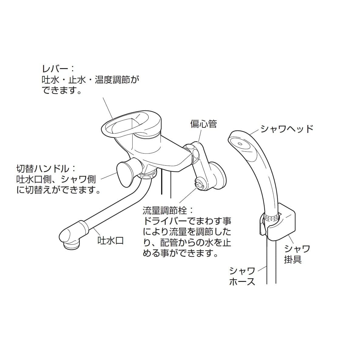 切替ハンドルを右へ回すとシャワー側、左へ回すと吐水口側に切替えができます。