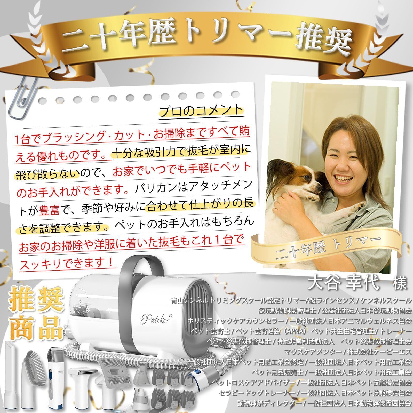 【20年プロトリマー推奨】【PATEKER LM3 一台で7役をこなす究極のペット用グルーミングキット】99.9%の抜け毛を一掃する強力吸引力と、ブラッシング&掃除機の機能が一体化した、ペットのケアに革命をもたらす製品です。細かい部分のトリミングから、ソファの隙間の清掃まで、これ一台で全て解決。付属の7種類のアタッチメントで、ブラッシング、バリカンカット、抜け毛除去がこれまでになく簡単に。ペットも飼い主も快適なケア時間を実現します。