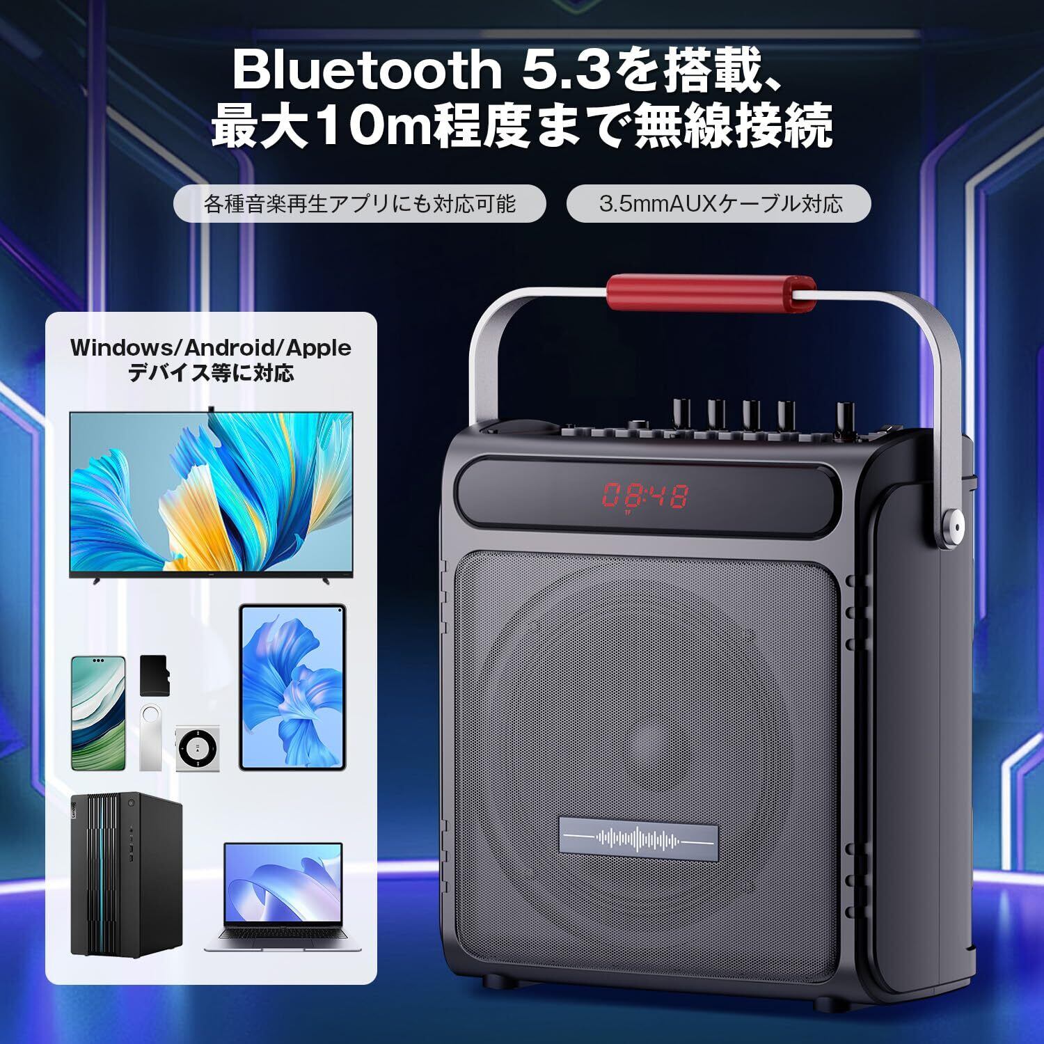 Moon River スピーカーセット カラオケセット 拡声器 Bluetooth 5.3対応 ワイヤレスマイク2本 高低音強化機能搭載 充電式 ポータブル カラオケマシン TF/USB/AUX/REC対応 ホームパーティー/室外/会議/防災/スピーチ/学校行事/セミナーなどに適用 日本語説明書付