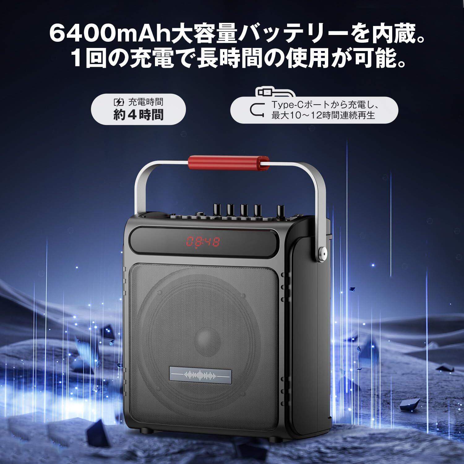 【液晶ディスプレイ&持ち運び便利】ポータブルワイヤレススピーカーには液晶ディスプレイが付いており操作しやすく、さらにリモコン付きでどこからでも遠隔でスイッチ操作が可能です。重量は僅か1.84kgで、ハンドル付きでストラップも付いており、移動、旅行時に手軽に持ち運びできます。野外ライブ、カラオケ(ワイヤレスマイク2本付き)セミナー、結婚式、防災などに大活躍してくれます。