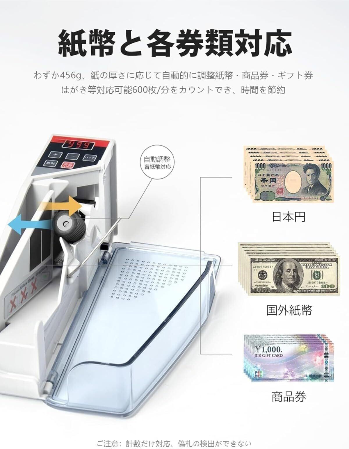 マネーカウンター 【紙幣保護機能・PSE認証済み】日本円専用設計 紙幣計数機 商品券 外貨 お札カウンター 充電式 携帯型 小型 紙幣カウンター 600枚/分高速カウント 枚数指定可能 バッチ機付き 簡単操作 業務用 携帯型 本文は英語