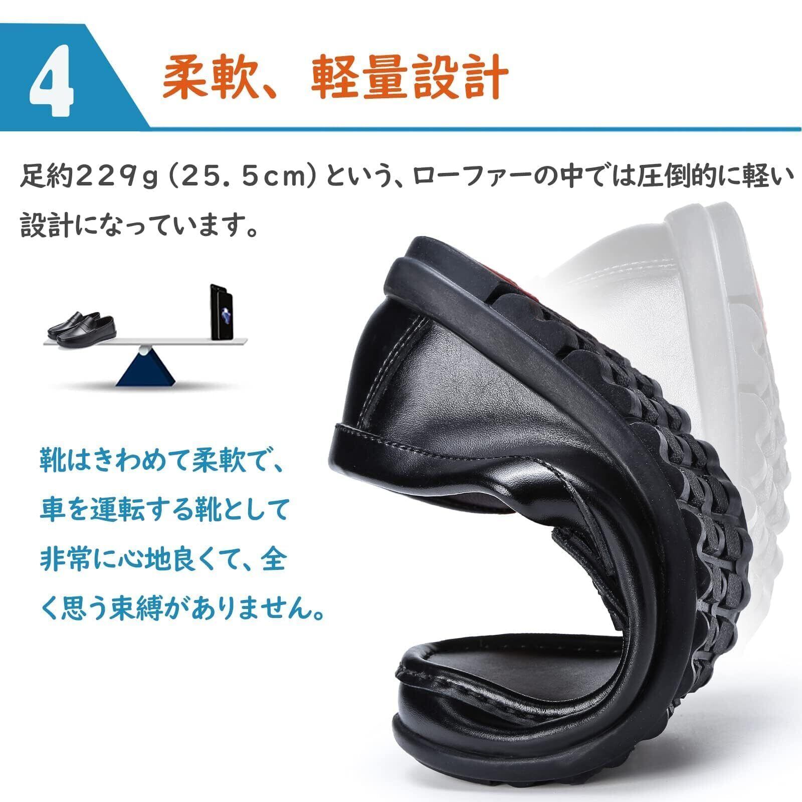 【ローファー メンズ 軽量】軽量設計、片足約229g(25.5cm)という、ローファー&ドライビングシューズの中では圧倒的に軽い設計になっています。天然ラテックス中敷搭載した、ソフトな質感なので長時間着用しても疲れにくく、ストレスを軽減してくれます。 3Eタイプのゆったりとしたモデルなので、広めの靴幅を探している方にもおすすめ。