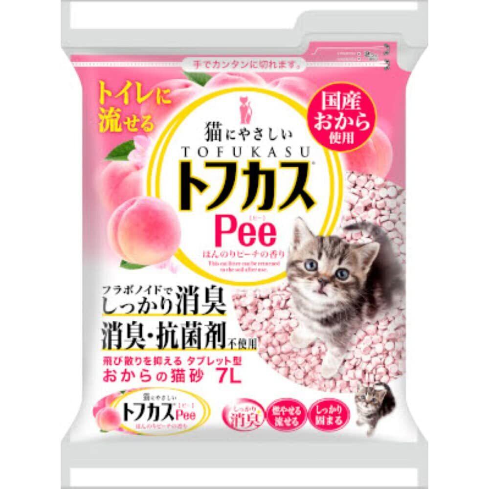 色と香りが出会って生まれた、ほんのりやさしいピーチの香り。燃やせる! 流せる! 固まる! エコな猫砂です! 。ピーチの香り付きで、砂自体のおからのニオイがありません。見た目もかわいいピンクの砂は、砂の飛び散りを抑えるタブレット型。トイレにこびりつきません。粉立ちが少なく、ホコリの心配がありません。燃やせるゴミに出しても、トイレに流しても処理出来ます。 <トフカスシリーズの猫砂は、全ておからを原料にしています。おからとは、大豆から豆腐を製造する過程で、豆乳を絞った際の搾りカスのことです。 おからのフラボノイド効果で、しっかり消臭、抗菌、殺菌をしてくれます。ペグテックでは、産業廃棄物となっている良質なおからを原料に、猫砂を作っています。豆腐の搾りカスだから、「トフカス」って名前なのです>