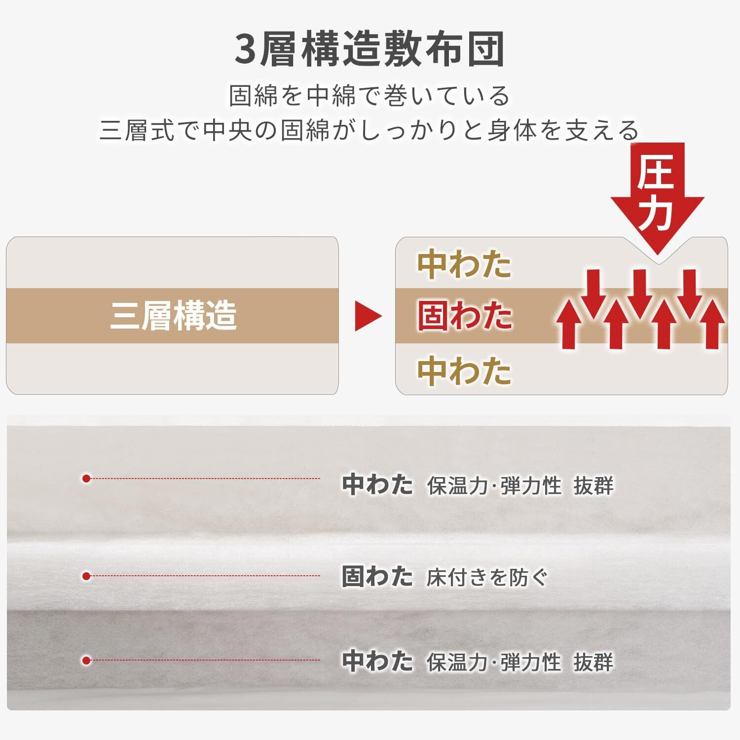 【3層構造布団】高弾性硬質綿と中綿の3層構造で、しっかり体圧を分散しながらサポート。優れた敷布団は、体のフィットカーブに合わせて柔軟に伸縮し、人体の圧力を和らげ、睡眠中の寝返りを減らし、高品質の睡眠環境を作り出します。