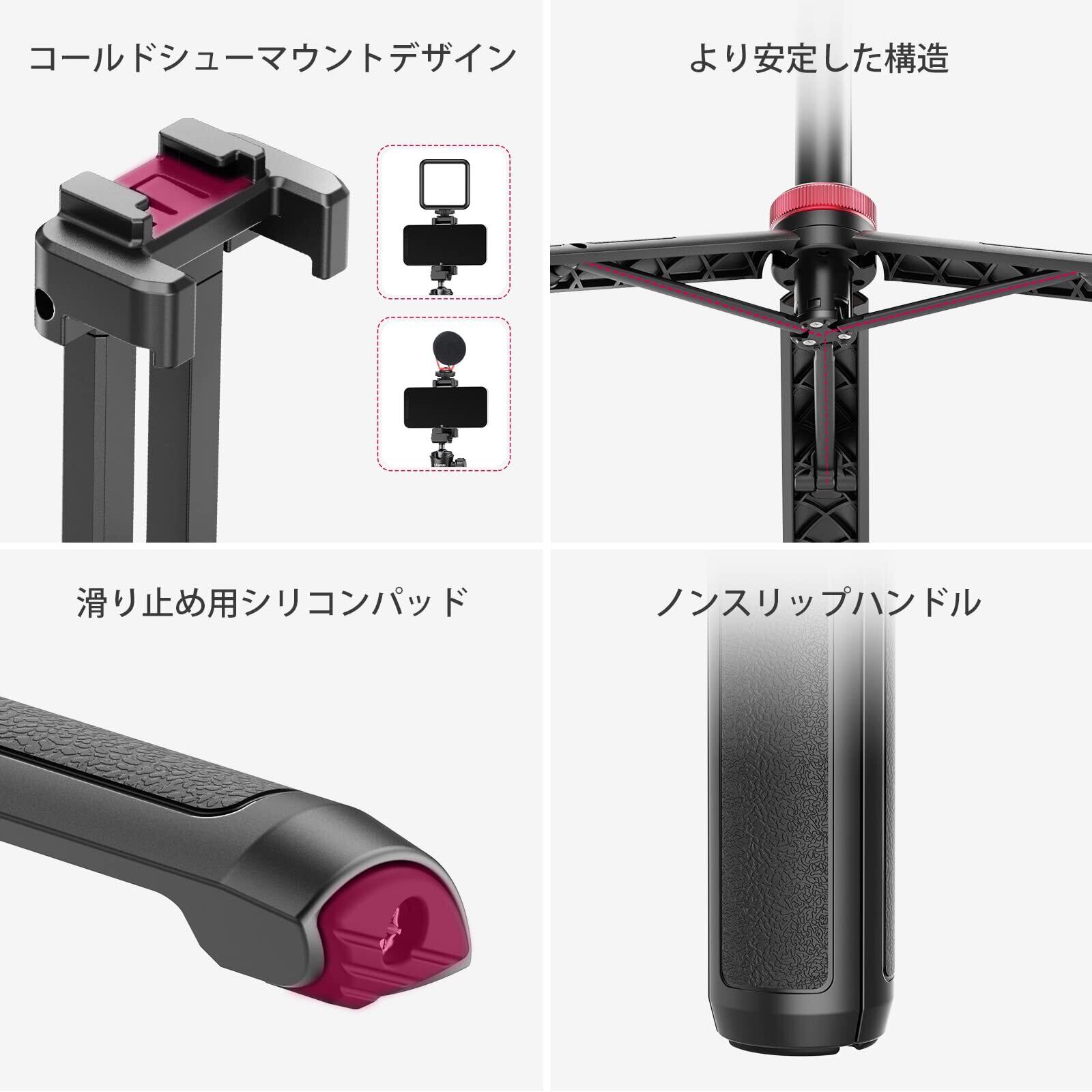 特徴 ボール雲台、2in1スマホクリップデザイン、6段伸縮