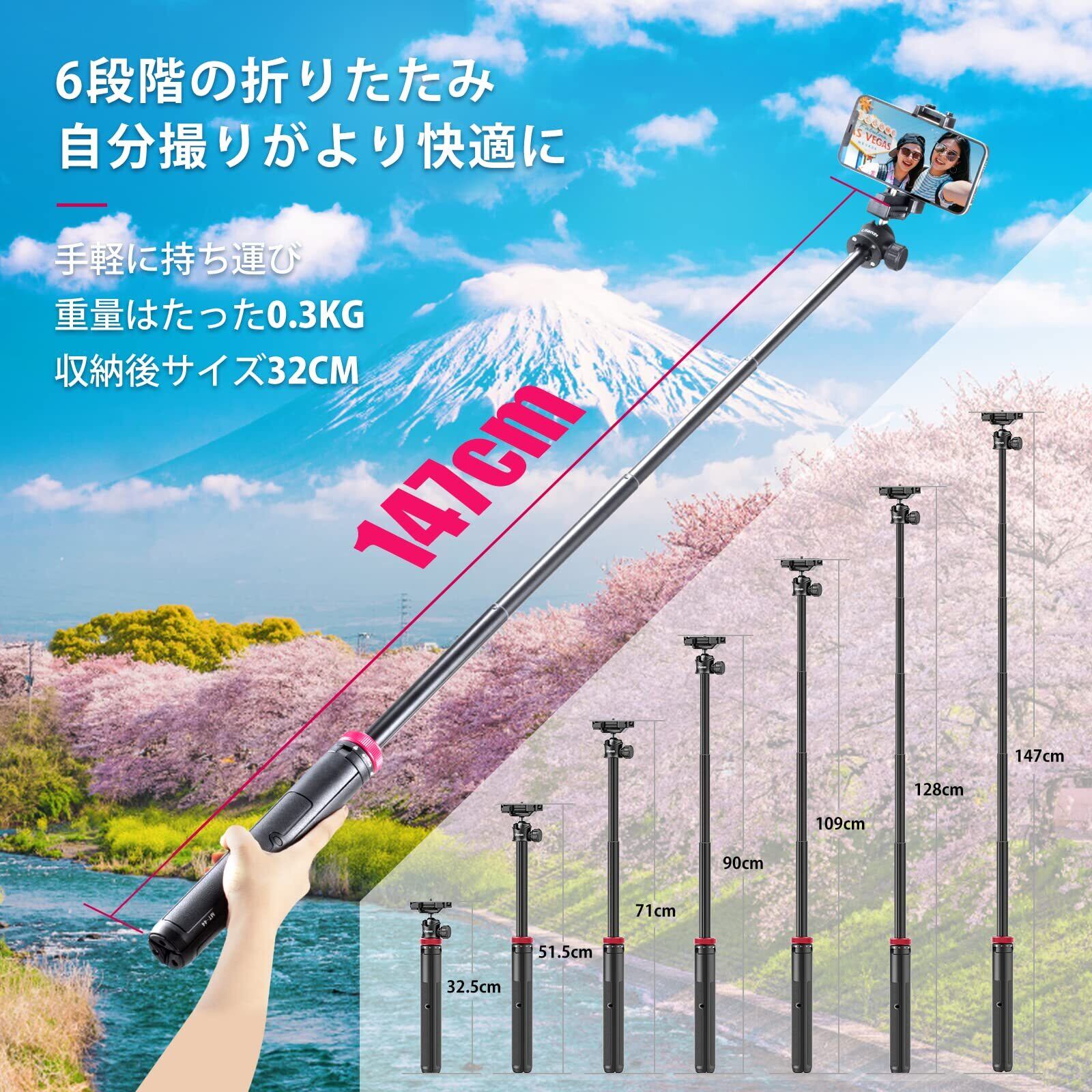 Ulanzi MT-44 三脚 スマホ三脚 カメラ三脚 147cm ビデオカメラ 自撮り棒 2in1スマホクリップデザイン 32cm-147cm 6段伸縮 ボール雲台 360度回転 軽量 vlogセルカ棒 折りたたみ 持ち運び便利 コールドシュー付き iPhone14/15/16用/Android/Sony用/Canon用/ビデオカメラ/アクションカメラ/アクションカム等に適用