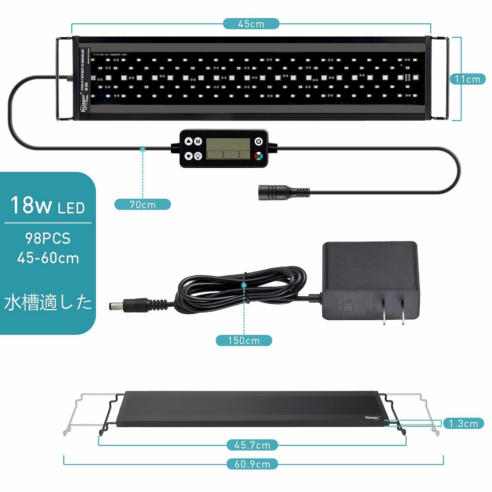 hygger 水槽ライト 新開発のDIYモード 45-60CM対応 WRGB割合を調整可能 タイマー自由に設定 LCDディスプレイ LEDアクアリウムライト 8色白/赤/橙/黄/緑/青/藍/紫LED 昼光と月光モード 10段階明るさ調整 IP68防水仕様 観賞魚飼育 水草育成用