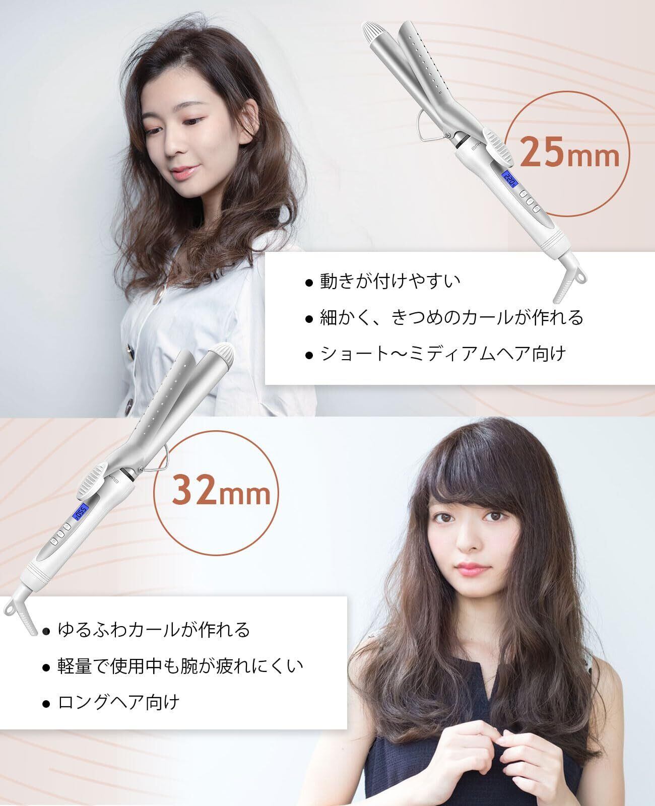 BAYATA コテ 32mm ヘアアイロン カールアイロン 100℃~220℃調節可能 25段階温度調節 プロ仕様 100V-240V海外対応 60分自動オフ ロングパイプ なめらか ロング/ショートヘア ボブ ふわふわカール