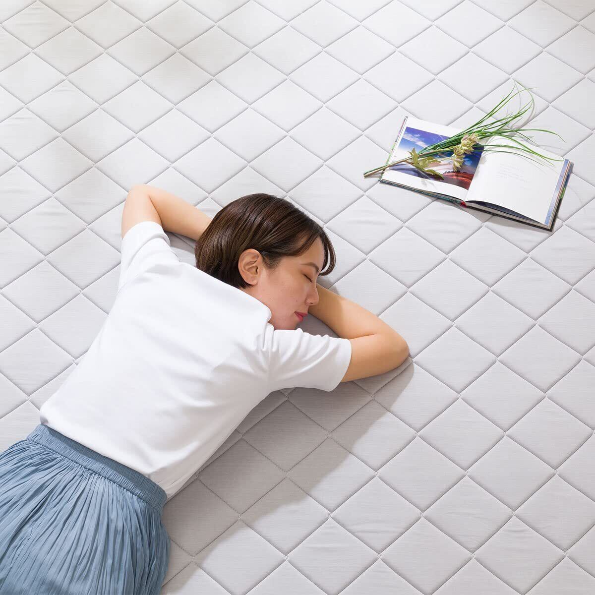 表生地は接触'強'冷感でひんやり冷たい。ウレタン入りでクッション性があり、座っても寝転んでも、気持ちいい爽やかな肌触り。