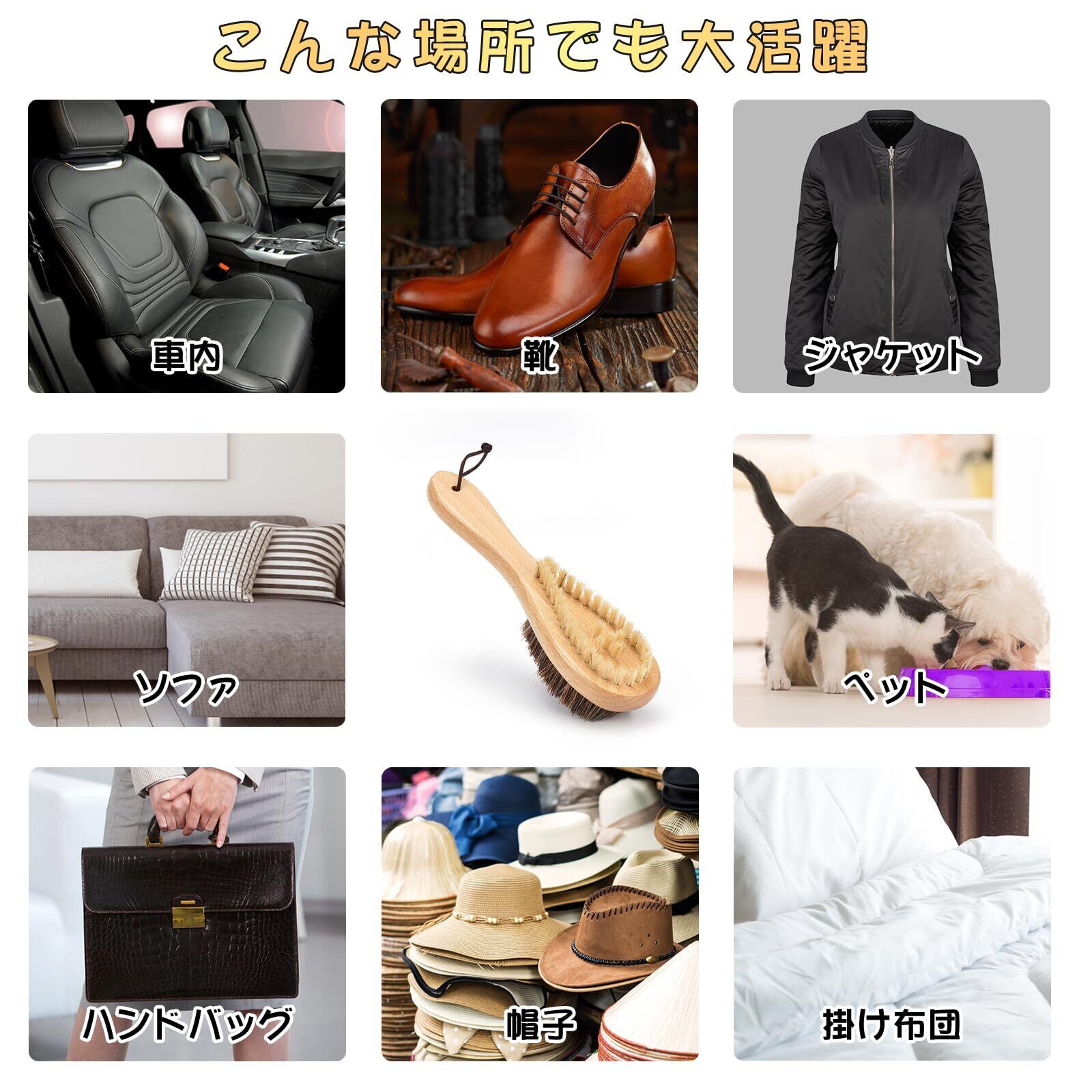 【両面の洋服ブラシ】馬毛ソフト面・豚毛ハード面・100%天然 100%天然な馬毛と豚毛を採用し、服の生地に負担をかけず、ほこりや花粉などをしっかり落とせます。ハード面はホワイトの天然豚毛なので、硬くて弾力が有る面が根元まで届いて毛玉を絡め取れます。ソフト面はブラウンの天然馬毛を採用し、柔らかい面が残った毛玉を取りつつ、繊維を整えます。(ご注意:獣毛100%の商品ですので、使い始めは多少毛が抜けますが、数回使用すると抜けなくなりますが、品質には問題ありません。)