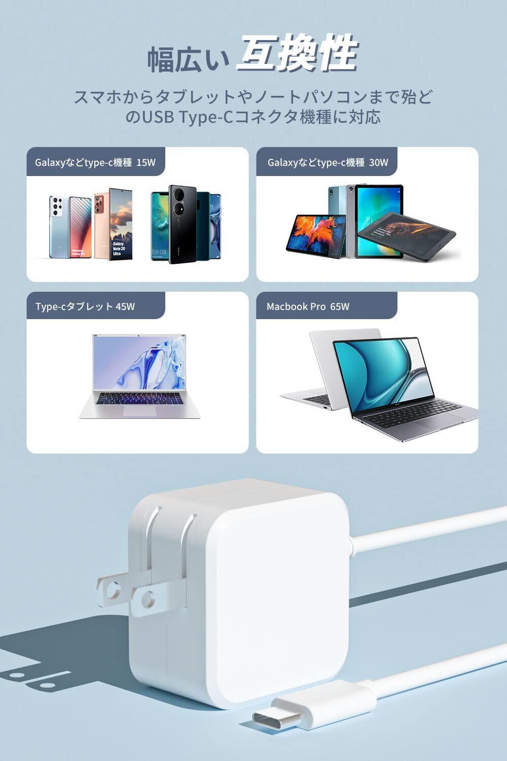 ▼【PD 67Wのすばやく充電】Macbook Pro 交換用充電器は最大67Wの高出力ですばやくノートパソコンを充電されます。67W超高速充電、充電スピートはMacBook proの充電器とほぼ同じで、MacBook Pro 15.4"を充電する場合、0%から100%までたった2時間でフル充電になります。PD 67Wだけでなく65W/ 45W/ 36W/27W/15Wも対応して、接続した機器によって、自動的に出力を判別し、スマートに適用の電圧と電流を提供できます。