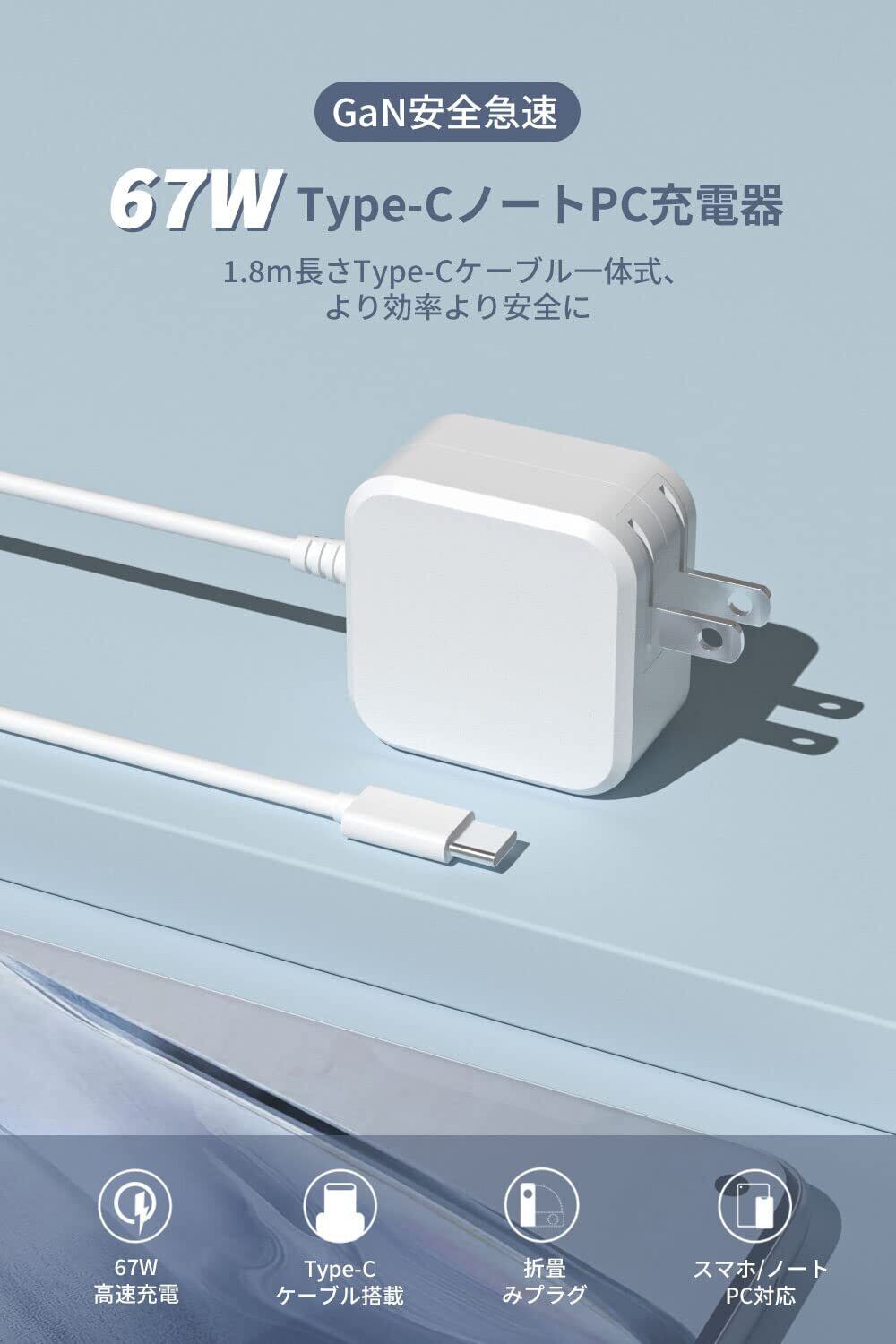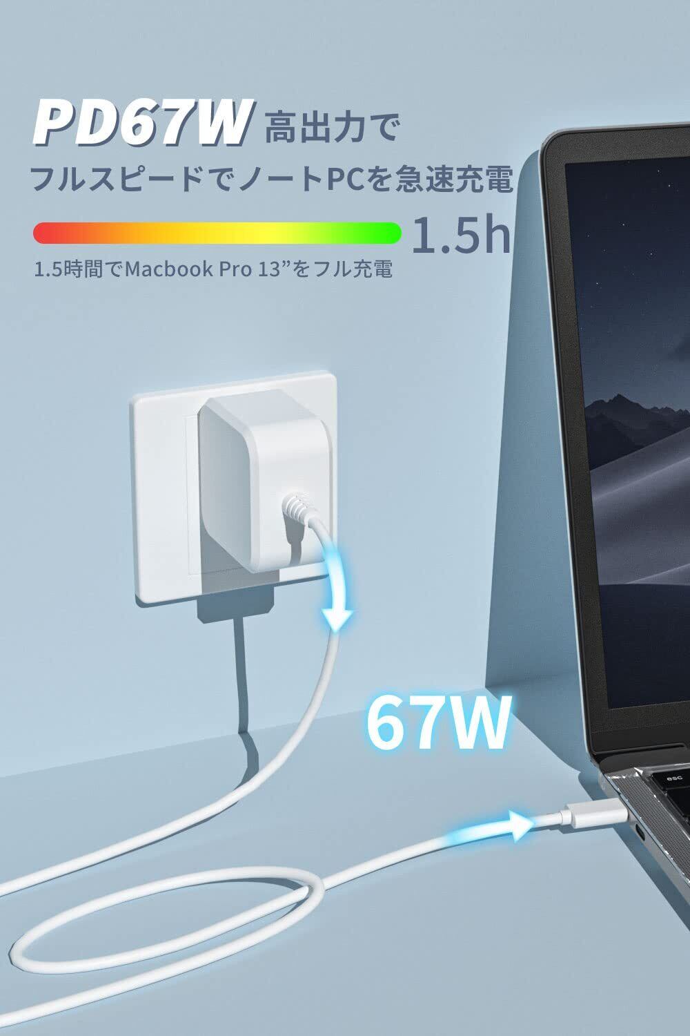 Macbook Pro 充電器 交換用 小型 Type-C PD対応 67w ノートパソコン 充電器 type-c Mac/Lenovo/レノボ ACアダプター 急速充電 1.8mケーブル一体型 (GaN+(窒化ガリウム)&PD 67w/65w/45w急速&折畳式プラグ&PSE】Mac 電源アダプタ 軽量 持ち運び Mac Book Pro対応/ノートPC/Switch/各種USB-C機器対応 (White)