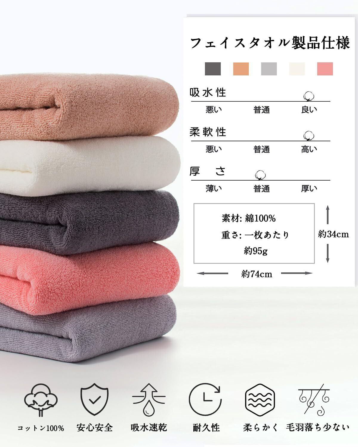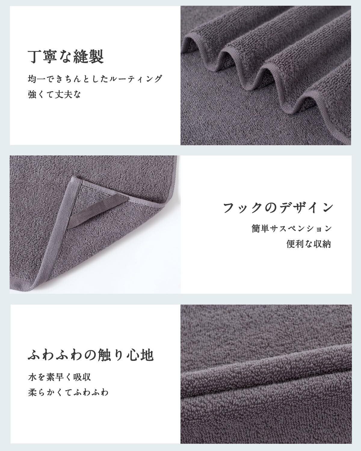 【フェイスタオル 10枚セット】素材:綿100%、サイズ:約34×74cm、重さ:1枚あたり 約95g 。セット内容: グレー 10枚。触れただけで水分を残さず拭ききれる、よく乾くから洗濯が苦にならない、万が一洗濯物を溜めてしまっても邪魔にならない。パイルが飛び出た場合、その部分をカットしてお使いください。そのままにしますと、洗濯の際に引っ掛かってほつれてくる場合があります。