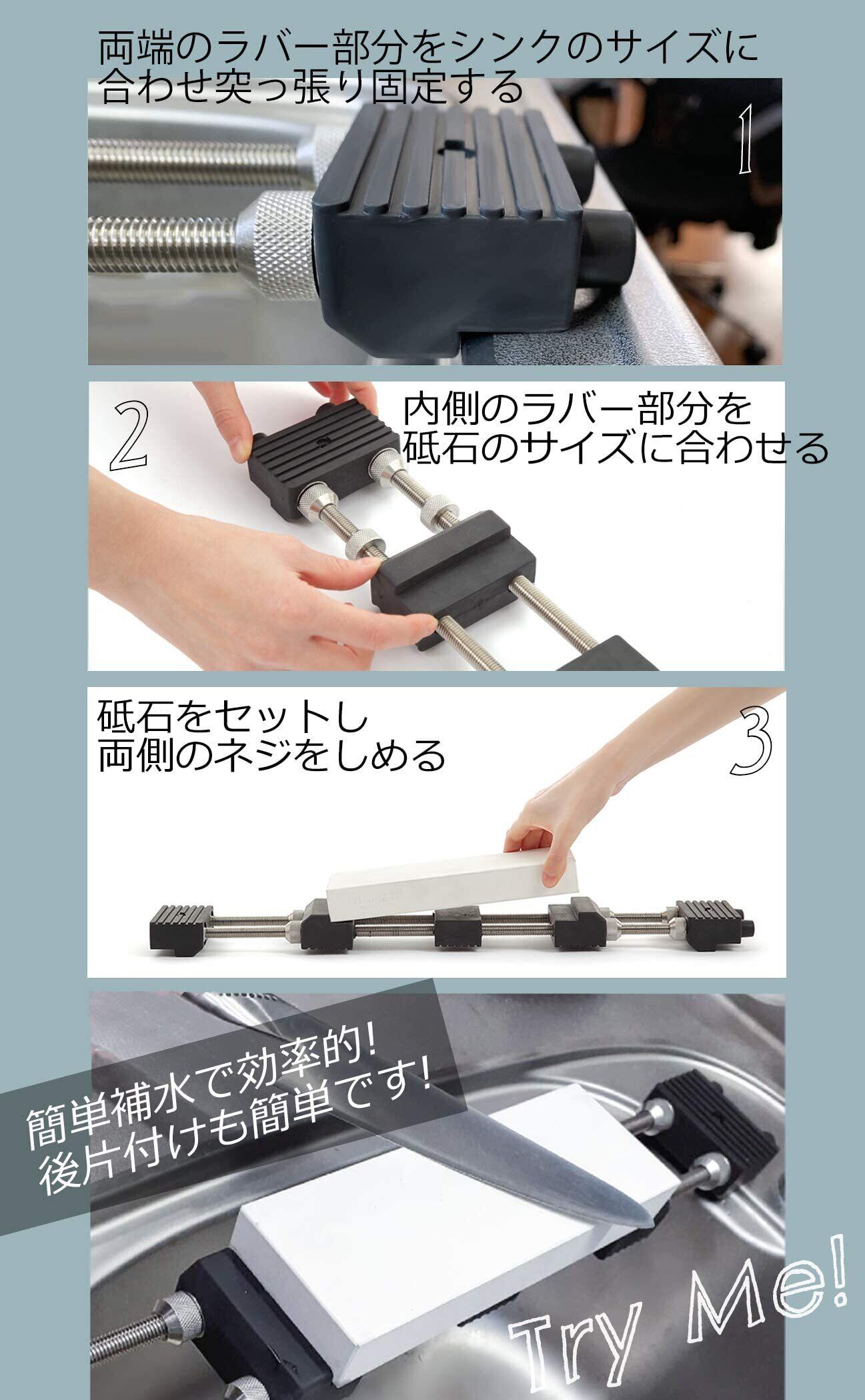 【シンクブリッジ】Someieの砥石台は、シンクに橋渡しすることで抜群の安定を発揮し、水で研ぎ汁を洗い流しながら使用可能な便利品です。包丁研ぎ台として優れた安定性を提供し、滑り止め加工を施した合成ゴムのベースと、砥石を固定する力の方向を一致させるネジにより、砥石 ホルダーとして確実に固定されます。