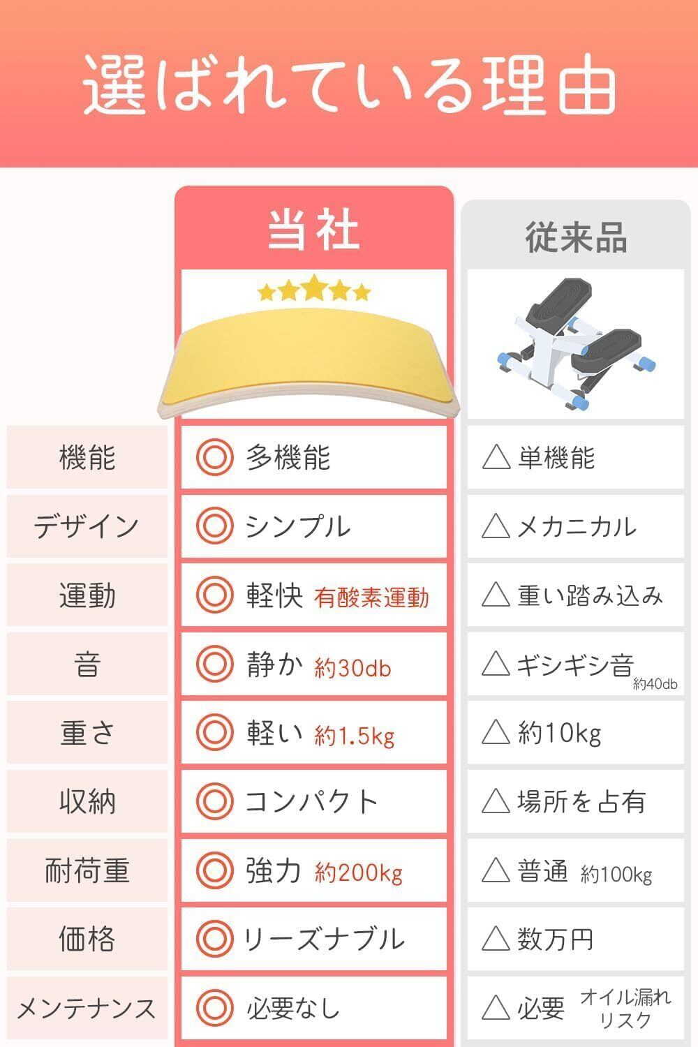 運動不足の罪悪感を解消!仕事・育児・テレワーク疲れ、ハードに運動したくない無い貴方。手術後リハビリ中、高齢者で運動したいけど、上手くできない貴方。そんな貴方にお勧めします。 超・継けられる! テレビを見ながらOK。テレワークしながらOK。 超・多機能!貴方のからだ全体をサポートします。お尻ダンス運動。前後左右ステッピング運動。背中伸ばしストレッチ。肩甲骨剥がし体操。フットレストにも。 超・静音!機械式ステッパーはどうしてもギシギシ音がします。当商品は極厚静音フェルトで早朝、夜間も安心。アパート・マンション住まいの方も大丈夫。フロア傷の心配も御座いません。 超・耐荷重!特注の極厚1.8mm設計。耐荷重200kgなので安心してご使用頂けます。 超・ミニマル!天然木の優しさ。シンプルなアーチ。 超・便利!リビングを引き立てるので、後かたずけが不要です。片手で楽々持ち運びできます。