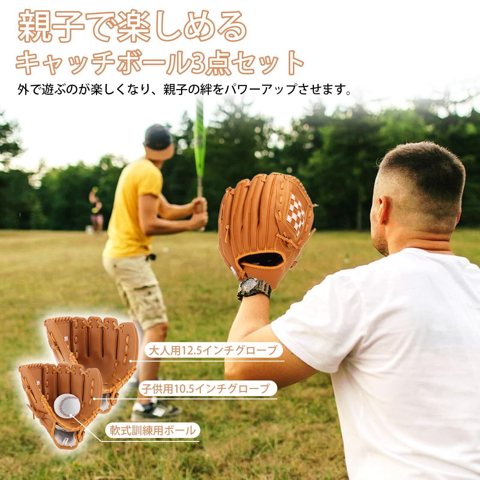 【親子キャッチボールセット】親子で楽しめるキャッチボールセットは少年&大人用12.5インチグローブx1・子供&少年用10.5インチグローブx1及び軟式訓練用ボールx1で組んでいます。3点セットなので、親子キャッチボールに最適。