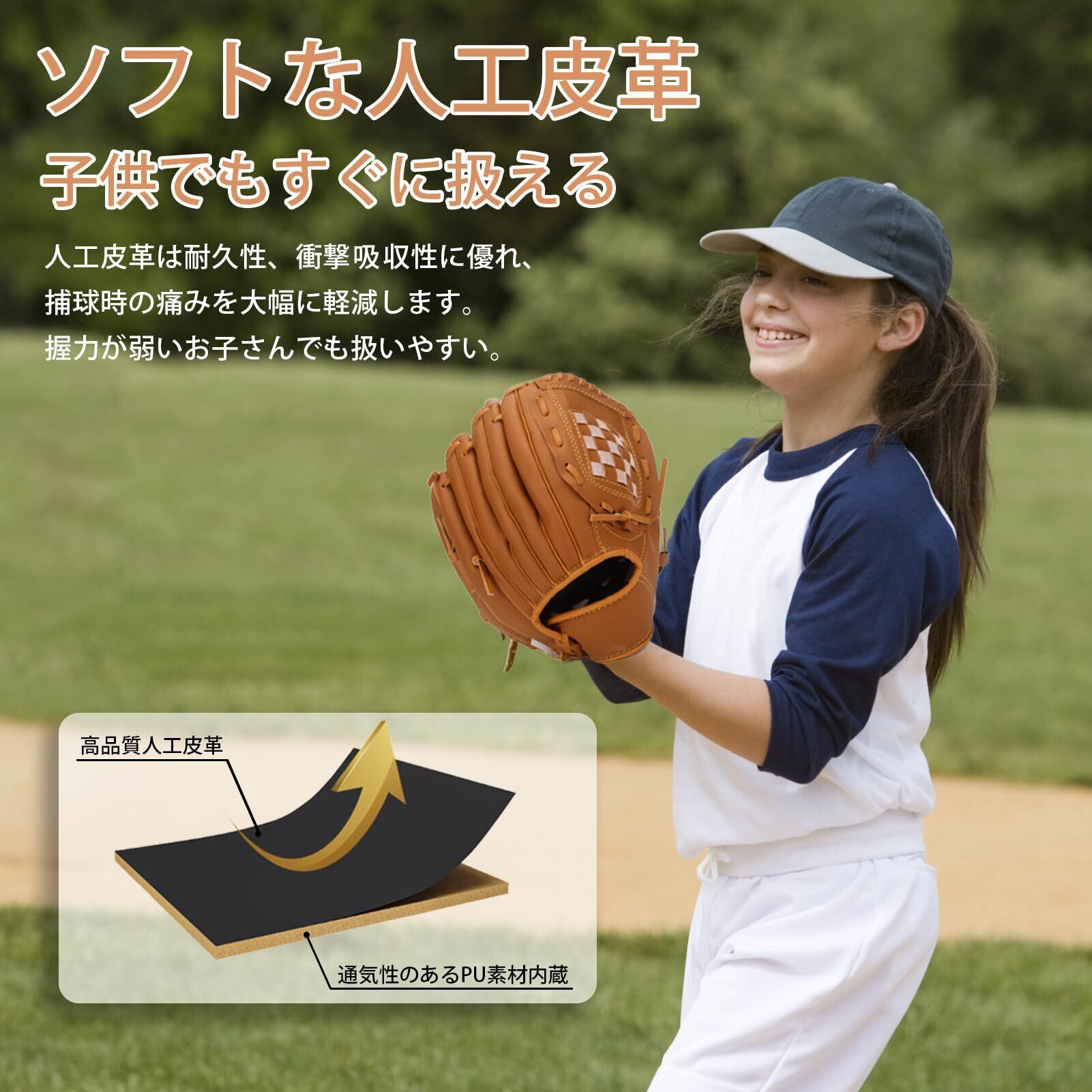 【柔らかくて子供でも使える】野球グローブは柔軟性と耐久性に富む人工皮革を採用し、しっかりと手にフィットするので、手に馴染みやすい、握力が弱いお子様でも扱いやすい。また、軟式グローブには衝撃吸収パッド内蔵なので、捕球時の痛みを大幅に軽減します!