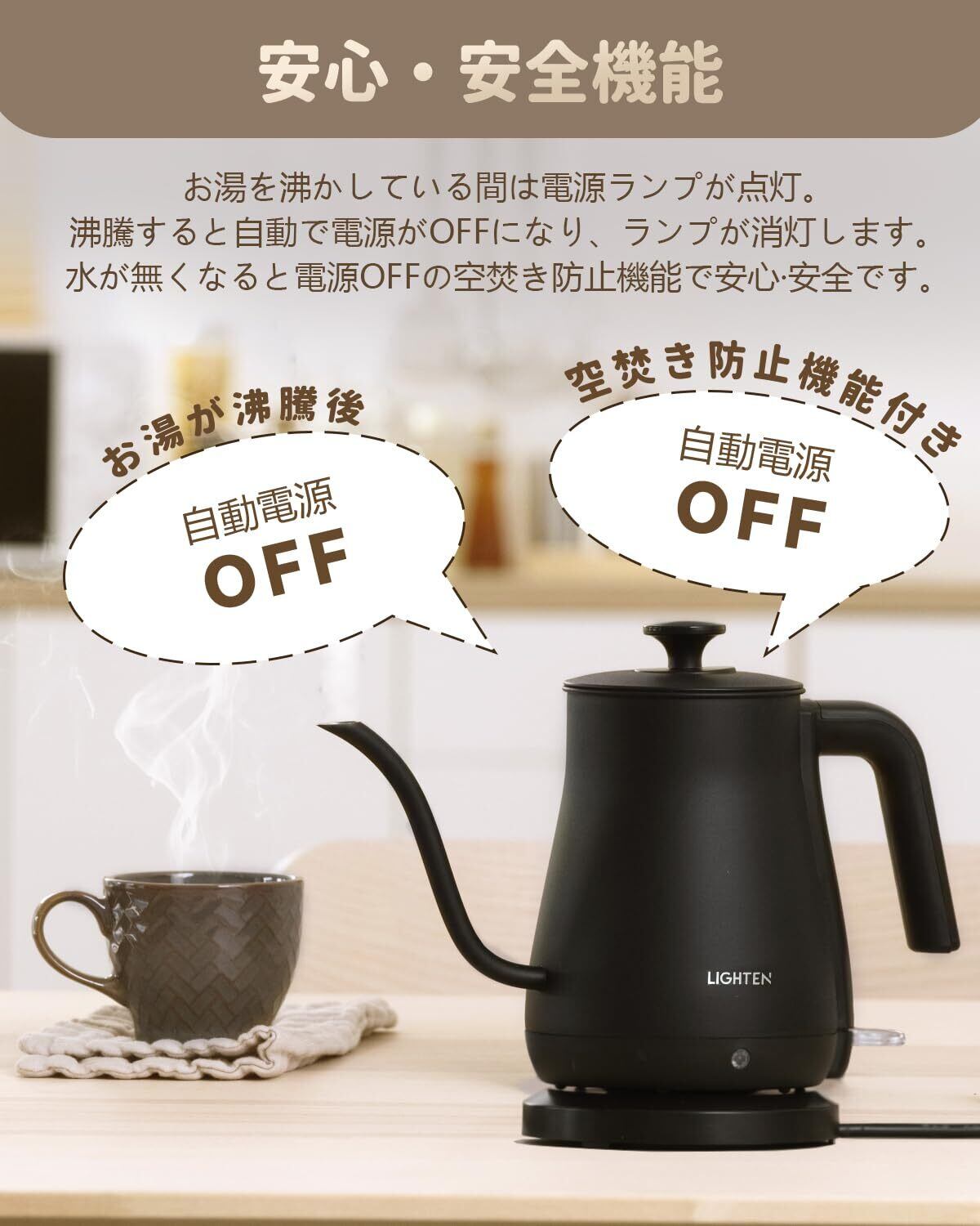 【安心の安全機能・空焚き防止設計電気ケトルの空焚き防止機能が、万が一水を入れ忘れた場合でも自動的に電源をオフ。沸騰後はランプが点滅し、自動停止でさらに安心。安全性を重視した設計で、小さなお子様がいるご家庭にもおすすめです。