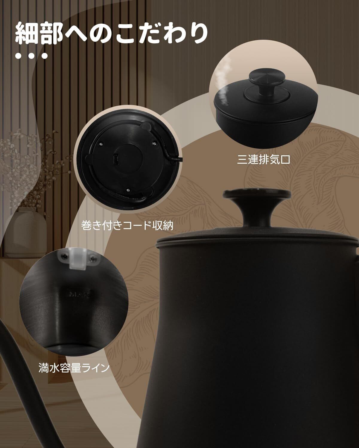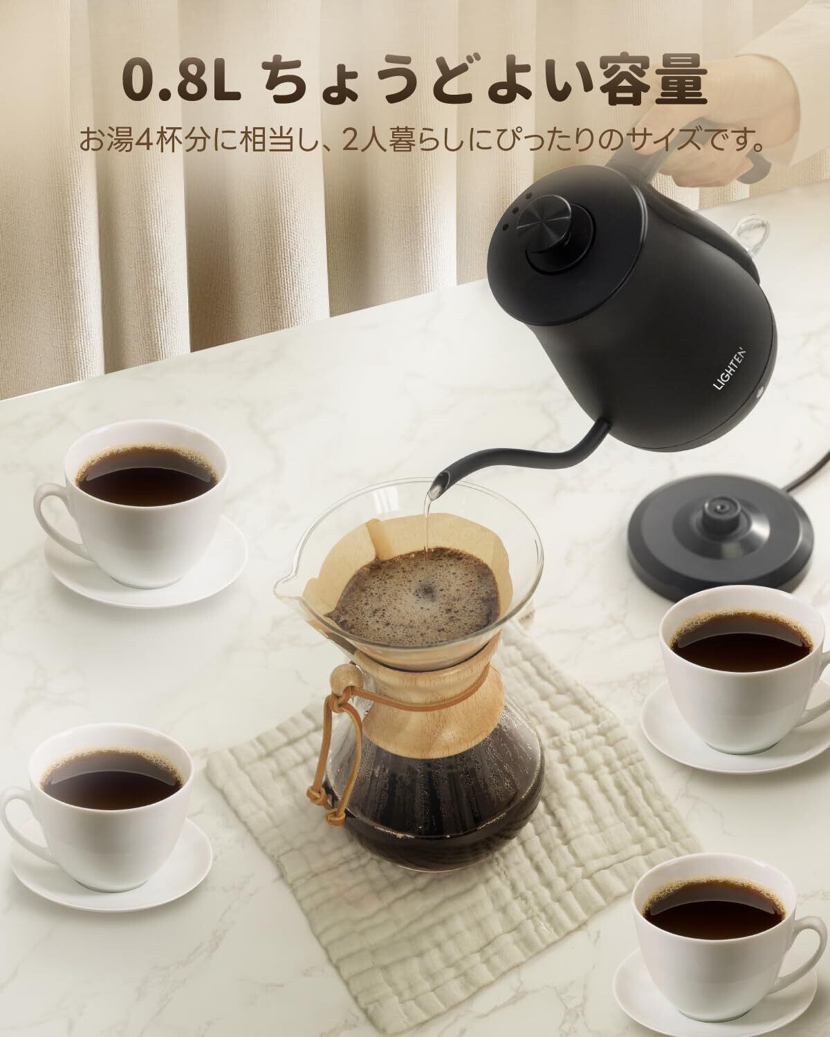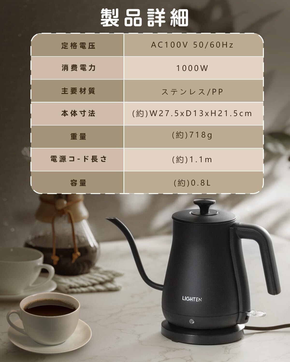 【細口デザインでプロのドリップ体験】ドリップコーヒーに最適な細口注ぎ口は、正確な湯量を注げる設計。湯切れがスムーズで、美しい一滴を楽しめます。手に馴染むハンドルと、マットな質感の洗練された外観が、キッチンに高級感をプラスします。