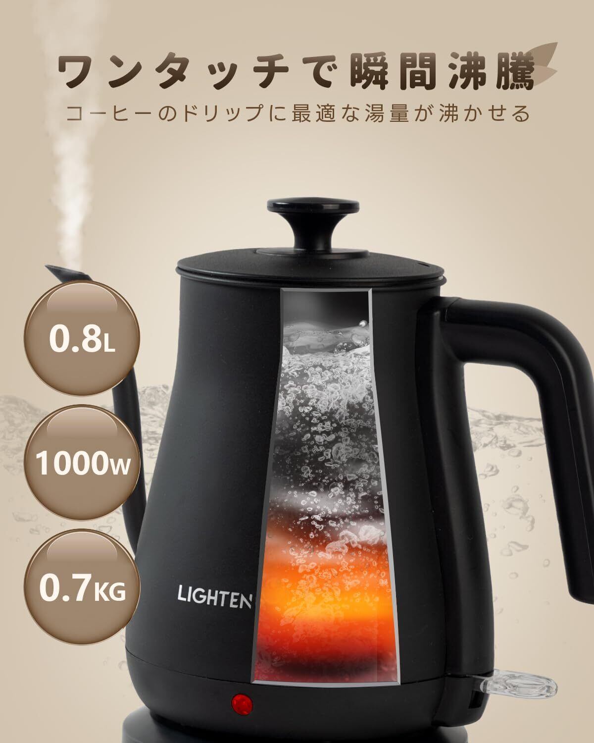 【ワンタッチで急速沸騰・適切な0.8L容量】スイッチひとつで簡単操作。800Wのハイパワーで、忙しい朝でも1杯分のお湯を短時間で沸かせます。0.8リットルの容量は、2〜3人分のドリンクにちょうど良く、一人暮らしや少人数家庭に最適です。