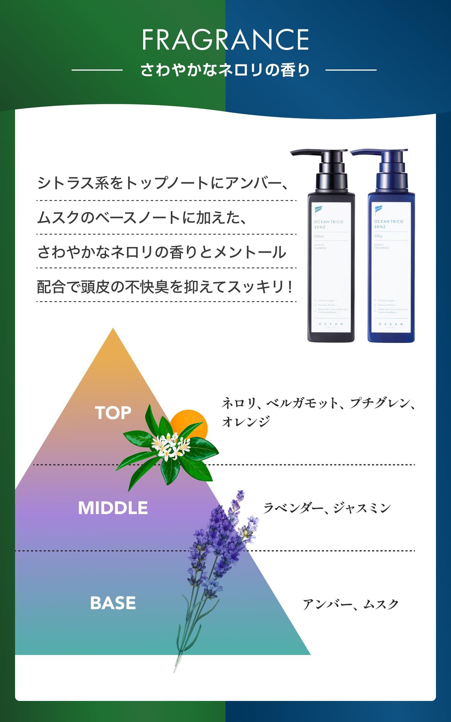 【さわやかなネロリの香り】シトラス系をトップノートにアンバー、ムスクのベースノートに加えた、さわやかなネロリの香りとメントール配合で頭皮の不快臭を抑えてスッキリ!