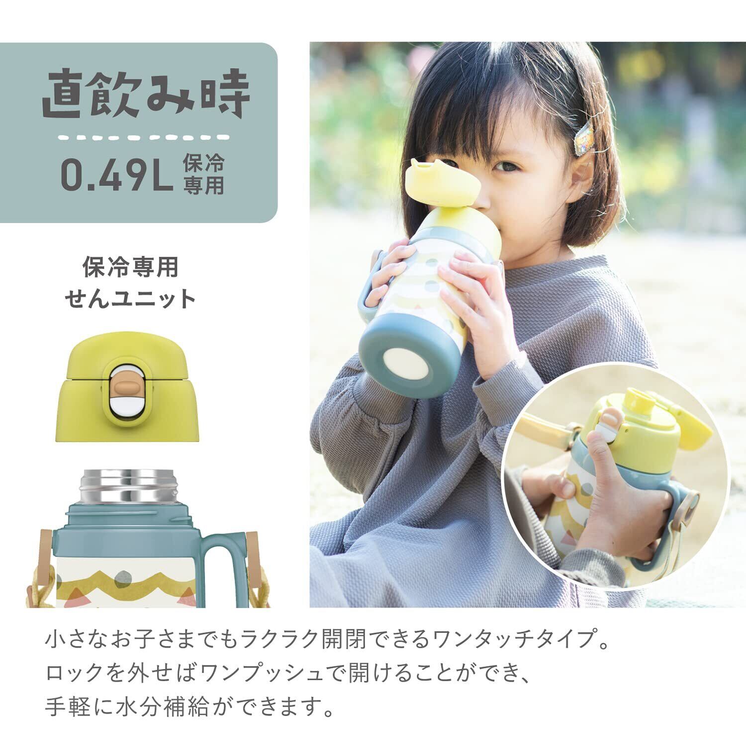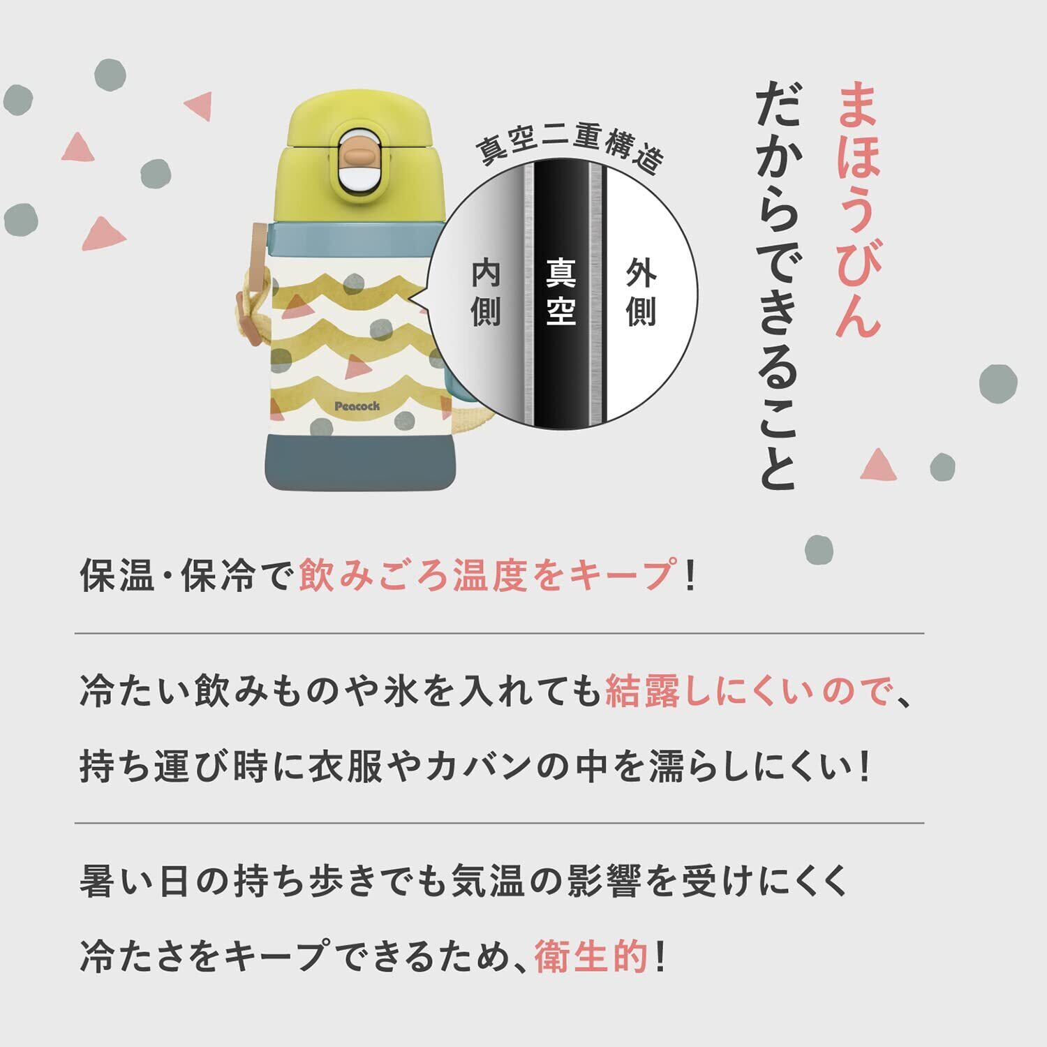 ステンレス真空断熱構造でしっかり外気温を遮断、保温(コップ飲み使用時)と保冷効果に優れています。●シーンに合わせてコップ飲みと直飲みの2種類の使い方ができる水筒です。●胴部にハンドルが付いているので、小さな手でも持ちやすい水筒。●本体の底部にシリコーン製の底カバーが付いていて瓶を傷や衝撃から守ります。●お出掛けに便利な長さが調節できるショルダーベルトが付いています。