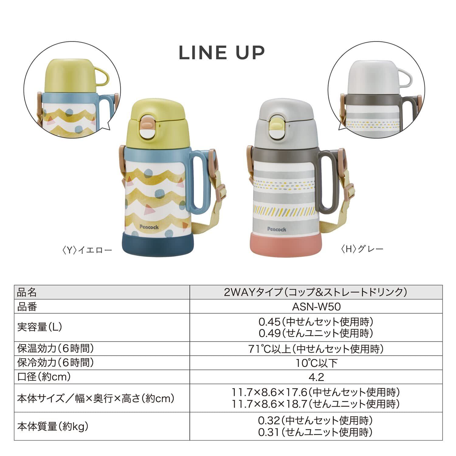 ピーコック魔法瓶工業(The-peacock) ピーコック水筒 子供 直飲み 保冷 0.49L コップ飲み 保温保冷 0.45L 2WAYタイプ 真空断熱構造 ワンタッチ ハンドル付 肩ひも付 ステンレスボトル イエロー ASN-W50 Y