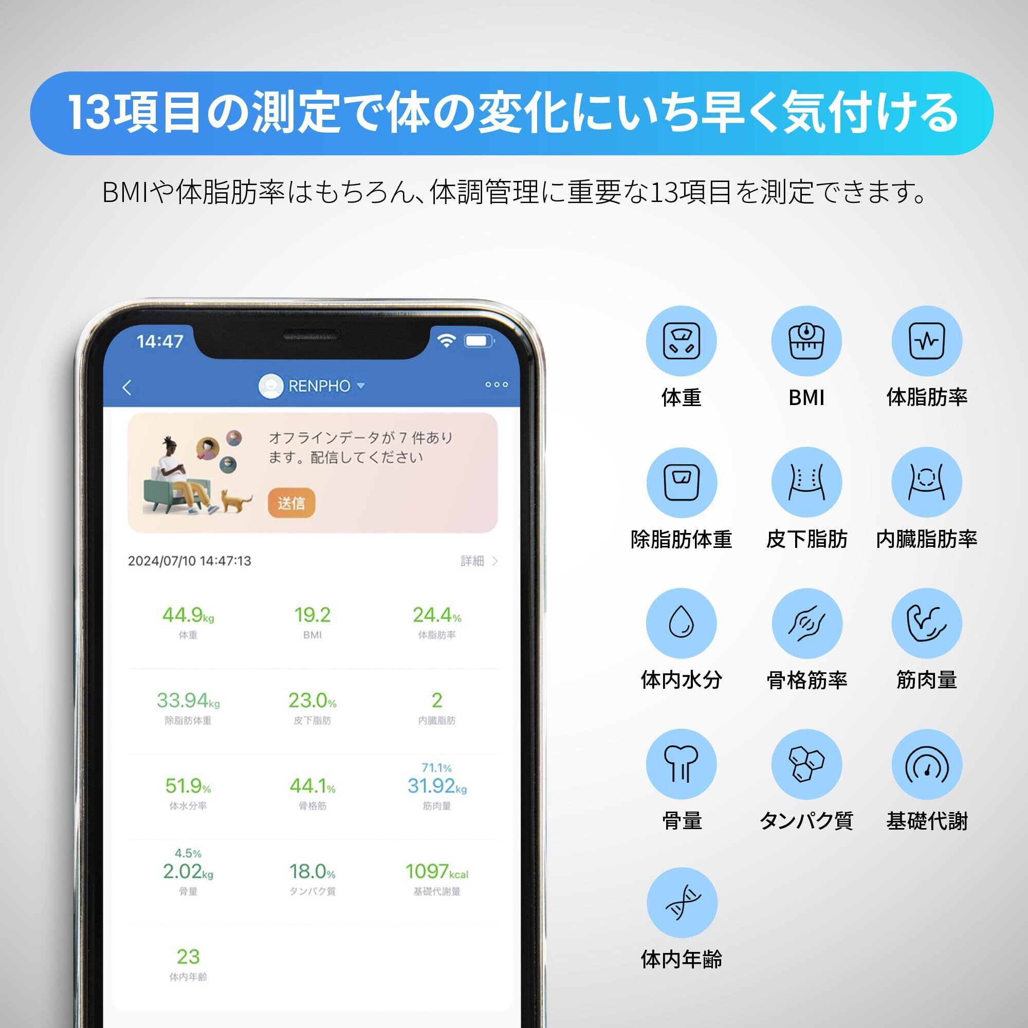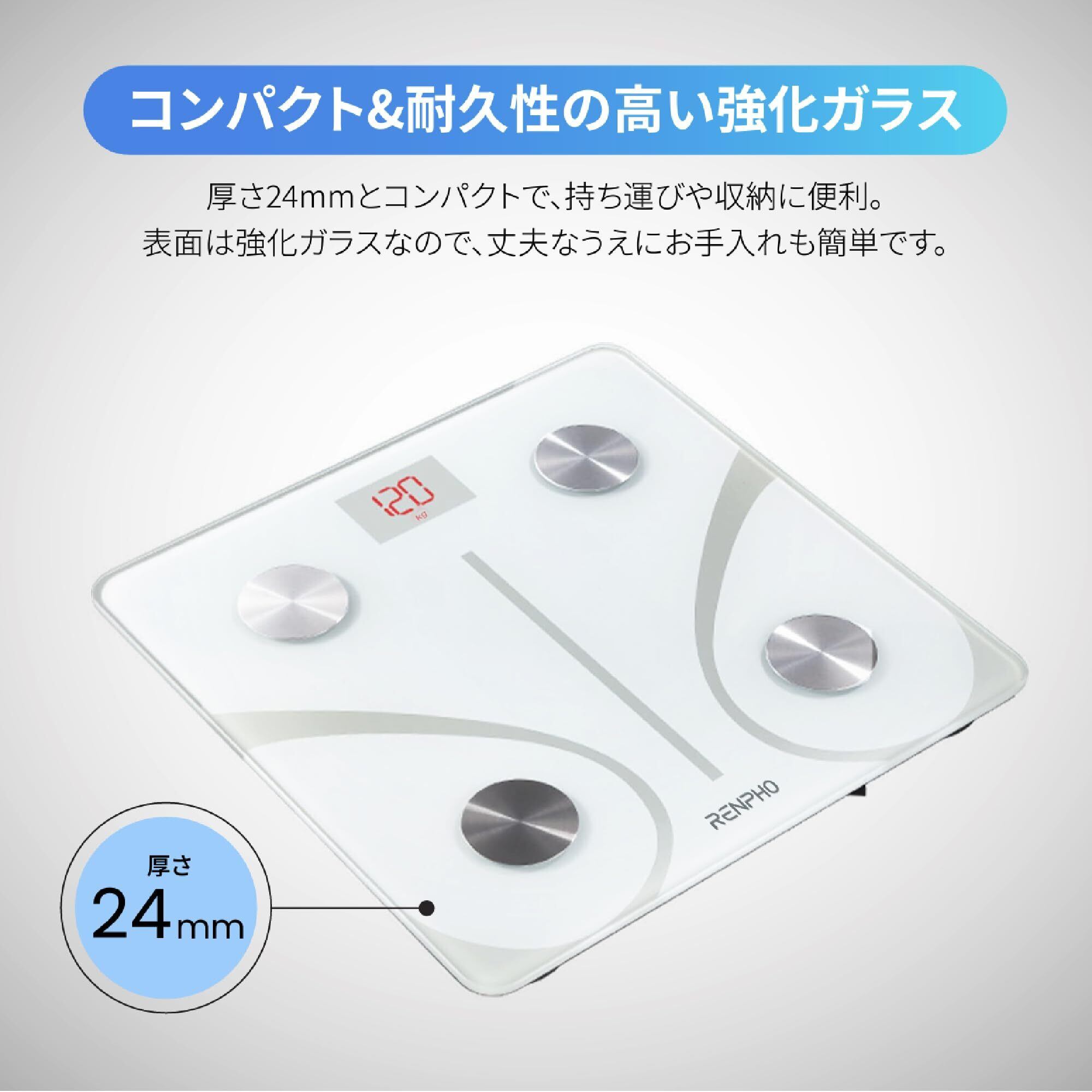 体重計 RENPHO レンフォ 体組成計 第二世代 Bluetooth接続 13項目測定可能 高精度 体脂肪計 強化ガラストップ 自動電源ON/OFF 日本語アプリ Renpho Health 健康管理 スマホ連動 登録人数無制限 体組成計 日本語取扱説明書 スリム 収納 データ管理 BIA技術 強化ガラス