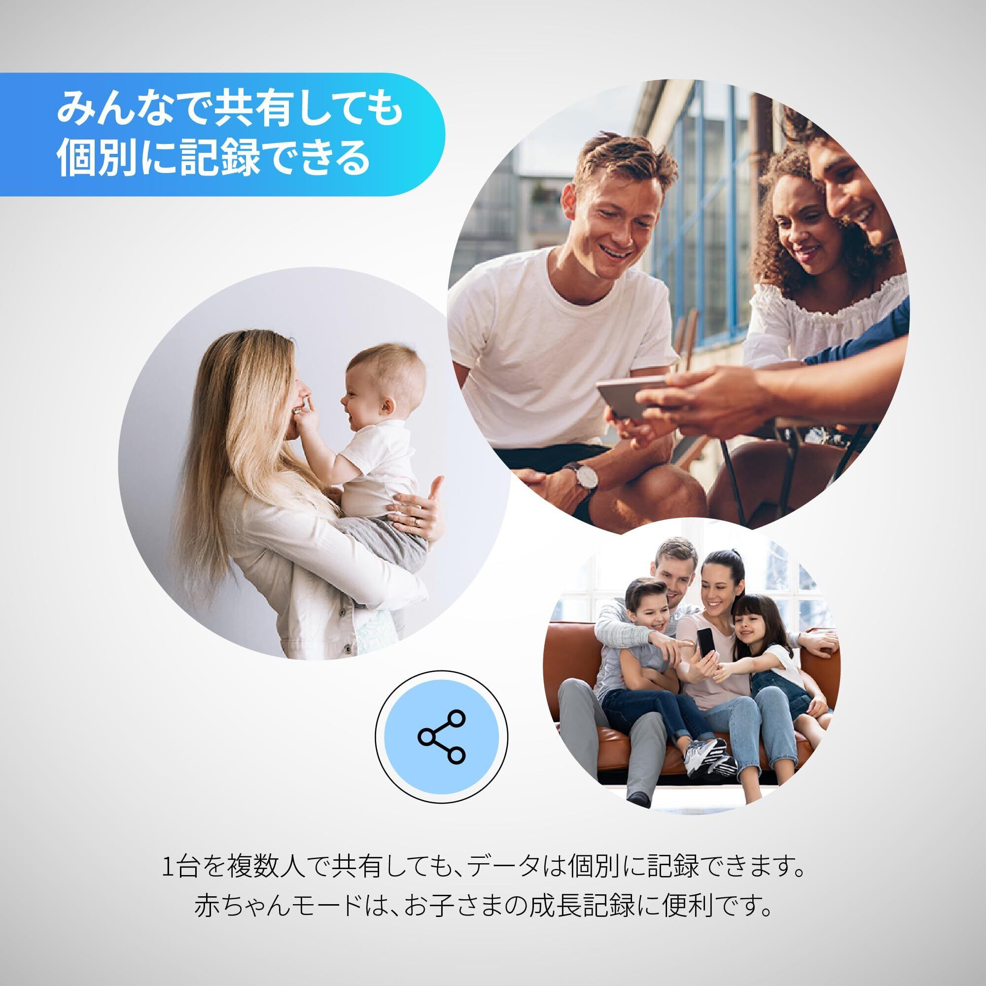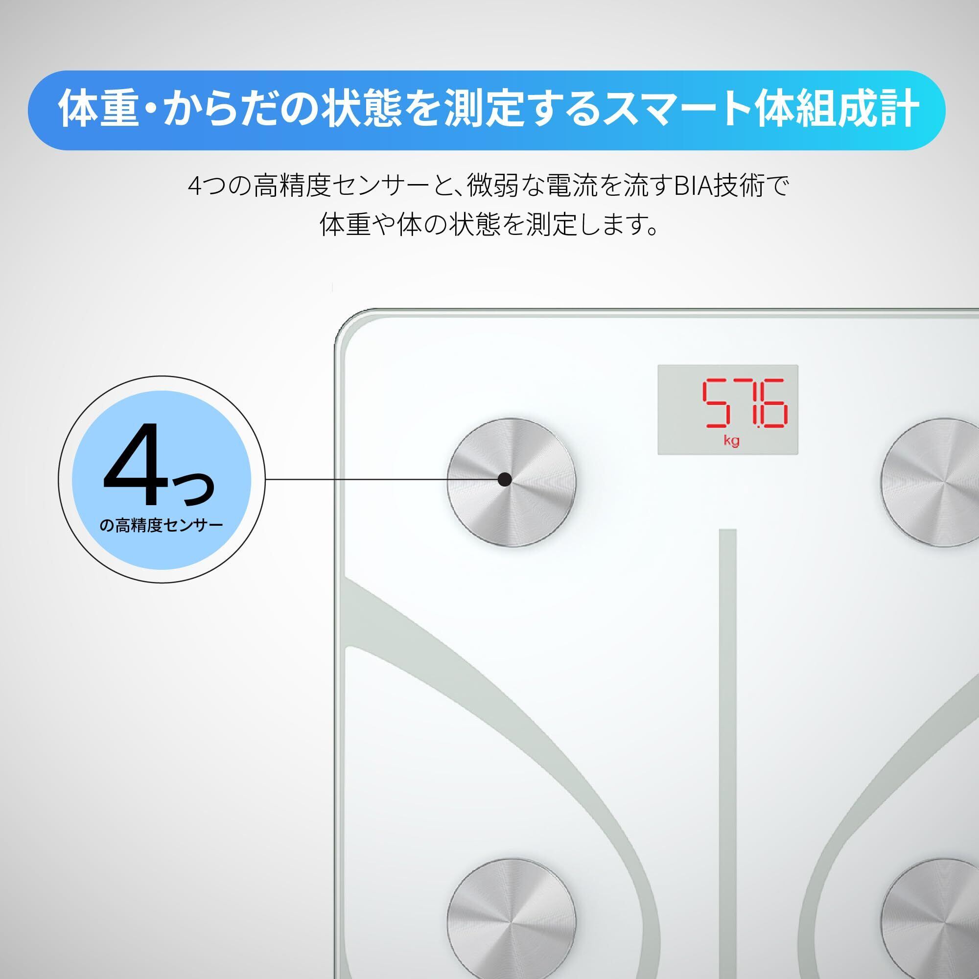 【体重とからだの状態を測定】4つの高精度センサーを搭載したスマート体組成計です。体重はもちろん、体に微弱な電流を流すBIA技術で、体調管理に重要な13種類の項目を測定します。計測単位は、Stone、kg、Ib、st:Ibの4つのからお選びいただけます。
