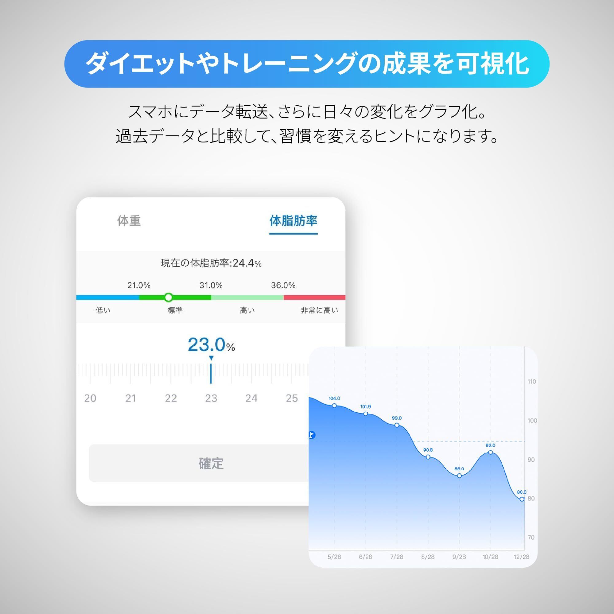 【アプリで日々の成果を可視化】専用アプリ「Renpho Health」とBluetooth連携すれば、体重などの健康状態をスマホに記録できます。さらにグラフを自動生成し、標準値や過去データと比較できるので、改善のヒントに繋がります。Apple HealthcareやGoogle Fitなど、他社アプリとも連携できます。