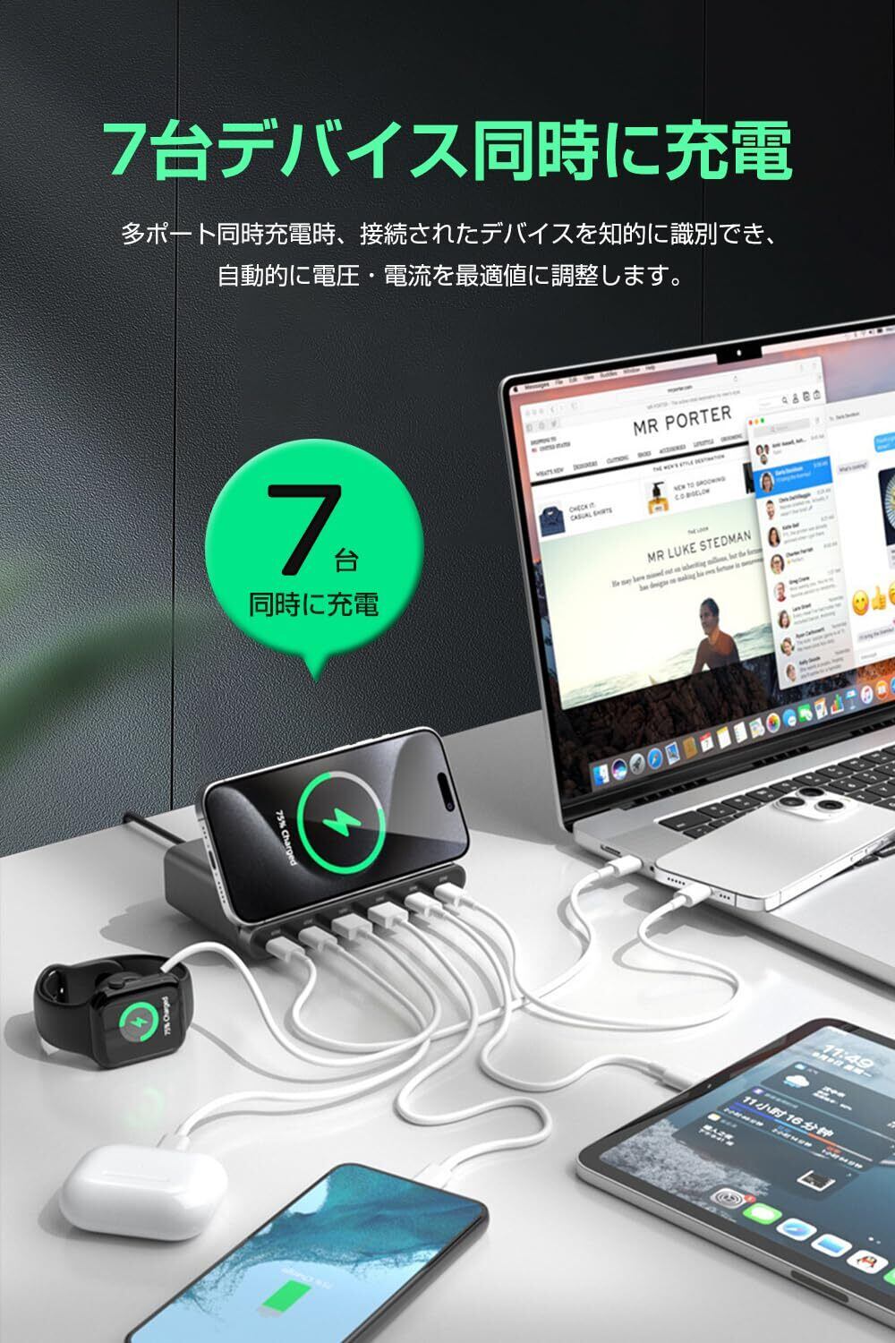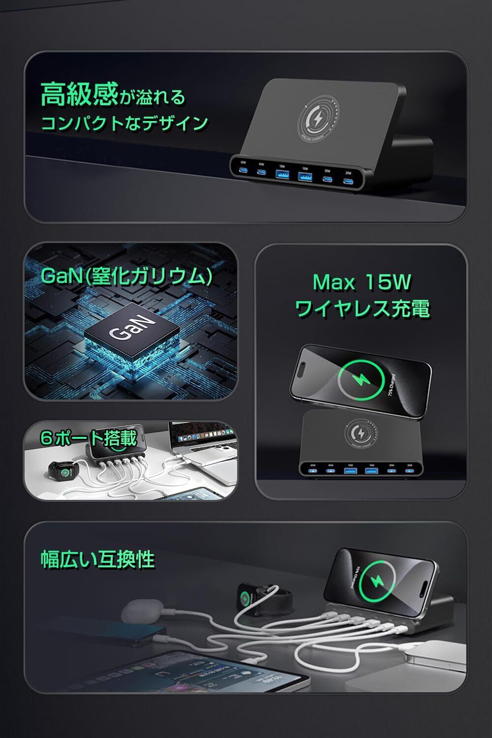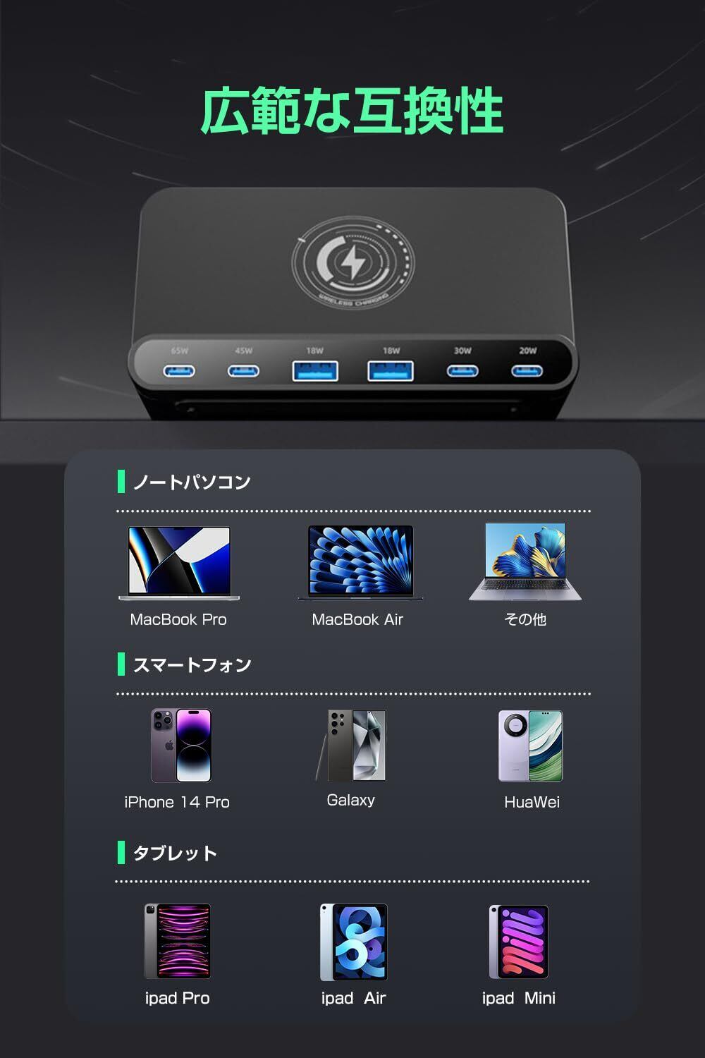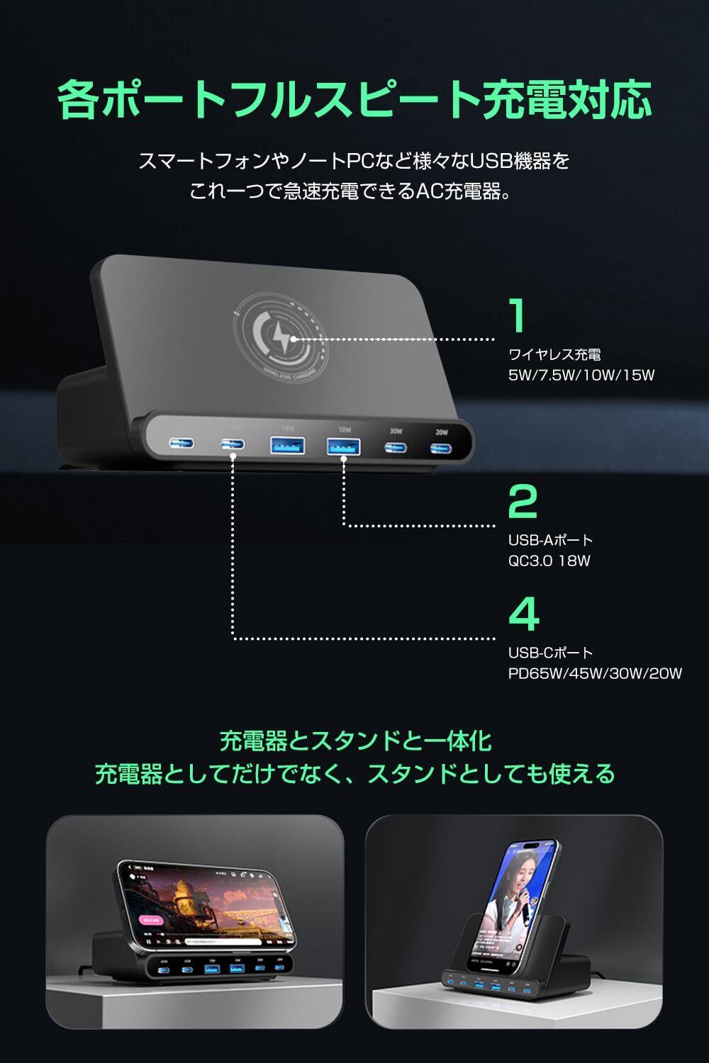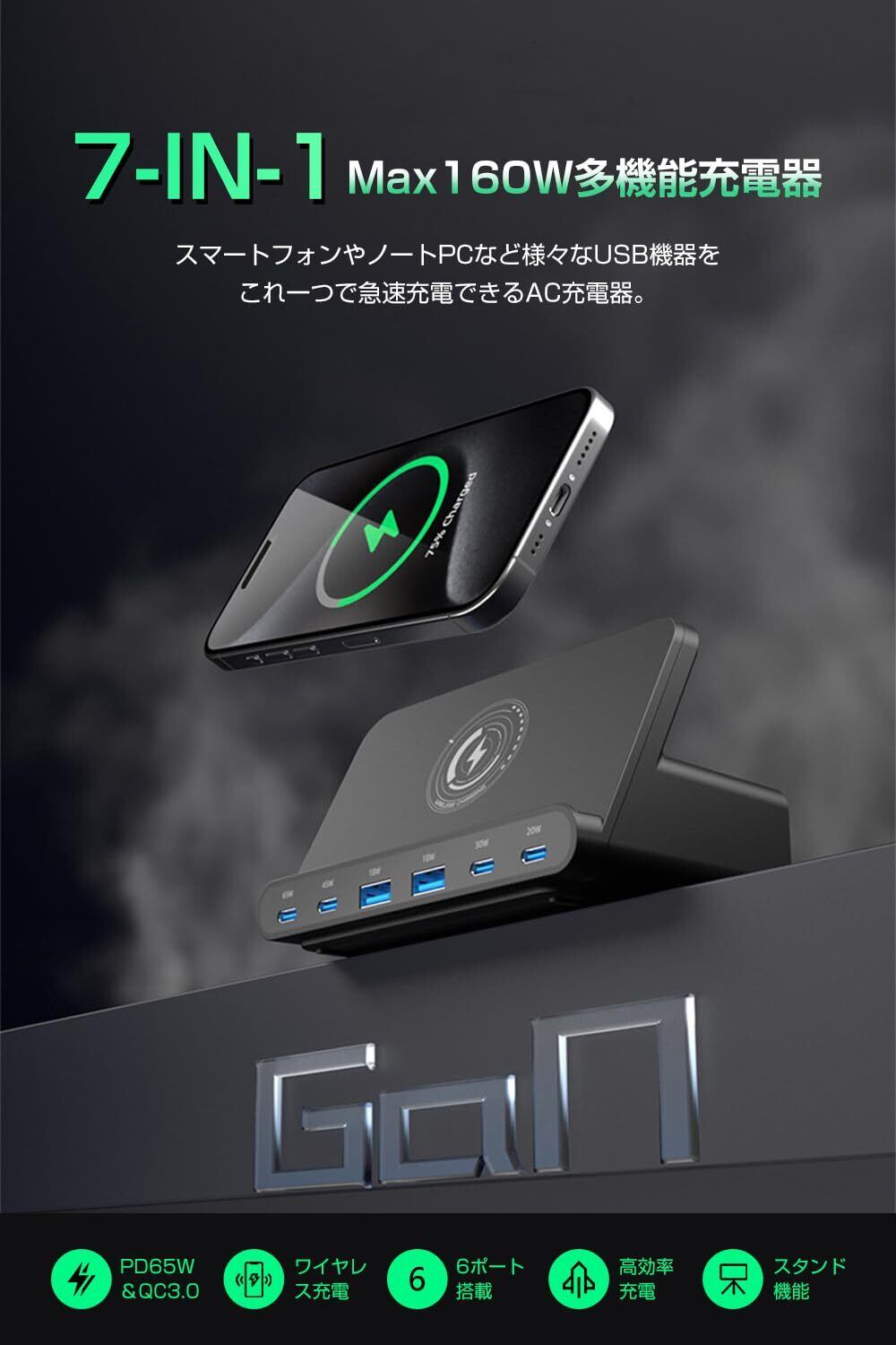 【7-IN-1・合計160W多機能充電器】多口USBコンセント、ワイヤレス充電機能、スマホスタンド機能を兼ね備えた多機能卓上充電器が登場しました。合計160W超高出力でノートPC、タブレットやスマートフォンなどの7台のデバイスを同時に充電ニーズを完璧に満足できます。これ1台でデスク周りをスッキリと整理でき、省スペースを実現しました!