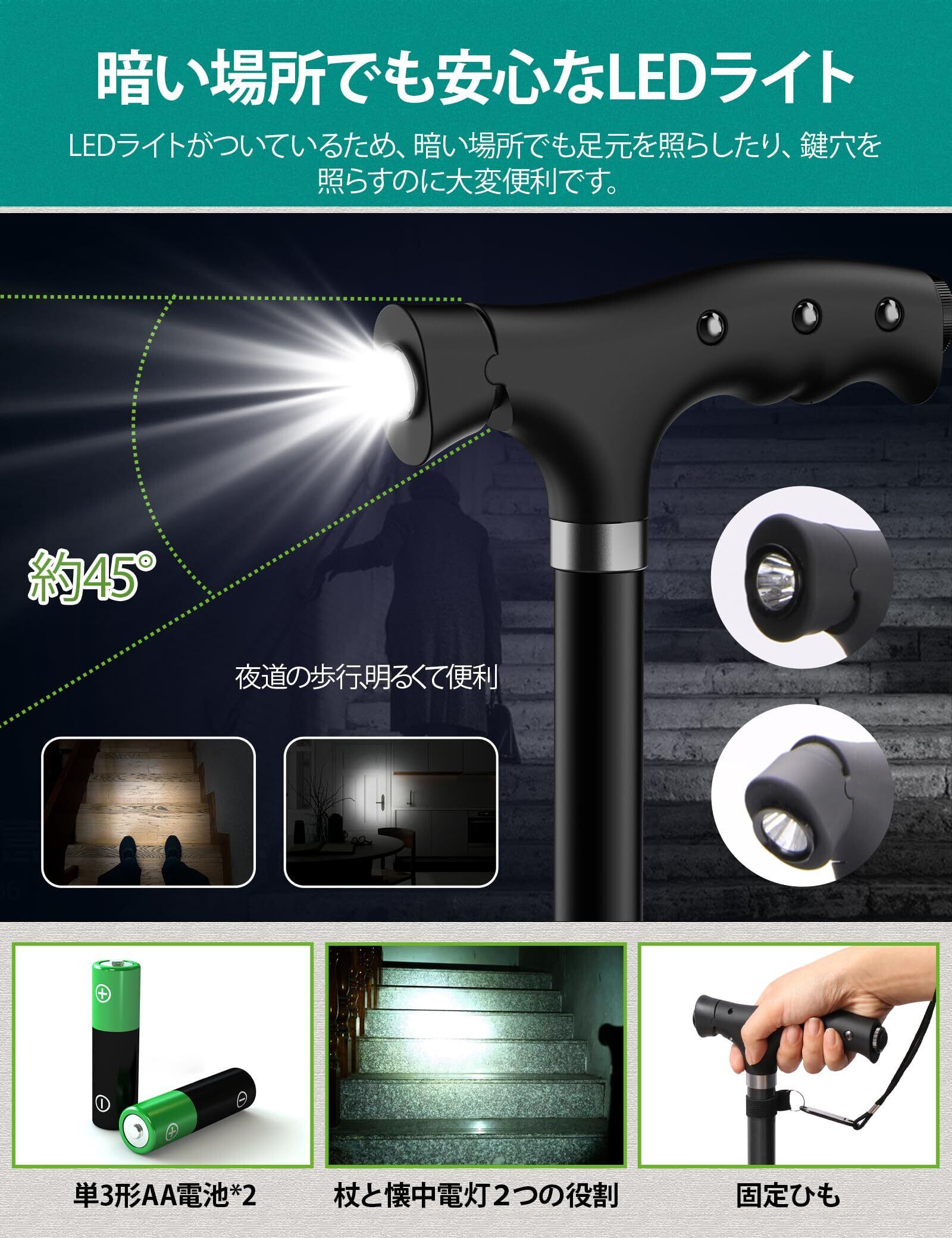嬉しい4点杖・自立型ステッキ:4点式と滑り止めのゴム脚で接地面をしっかり固定して、1点杖より広い面積でしっかり支えるため安定性抜群です。転びやすい坂道、濡れて滑りやすい階段、小石で不安のある砂利道も自信をもって歩けます。また、自立型ステッキなので、手を離しても倒れないから、レジでのお会計や家の鍵を開けるとき、手を洗うとき、くつを履くときなどに大変便利です。