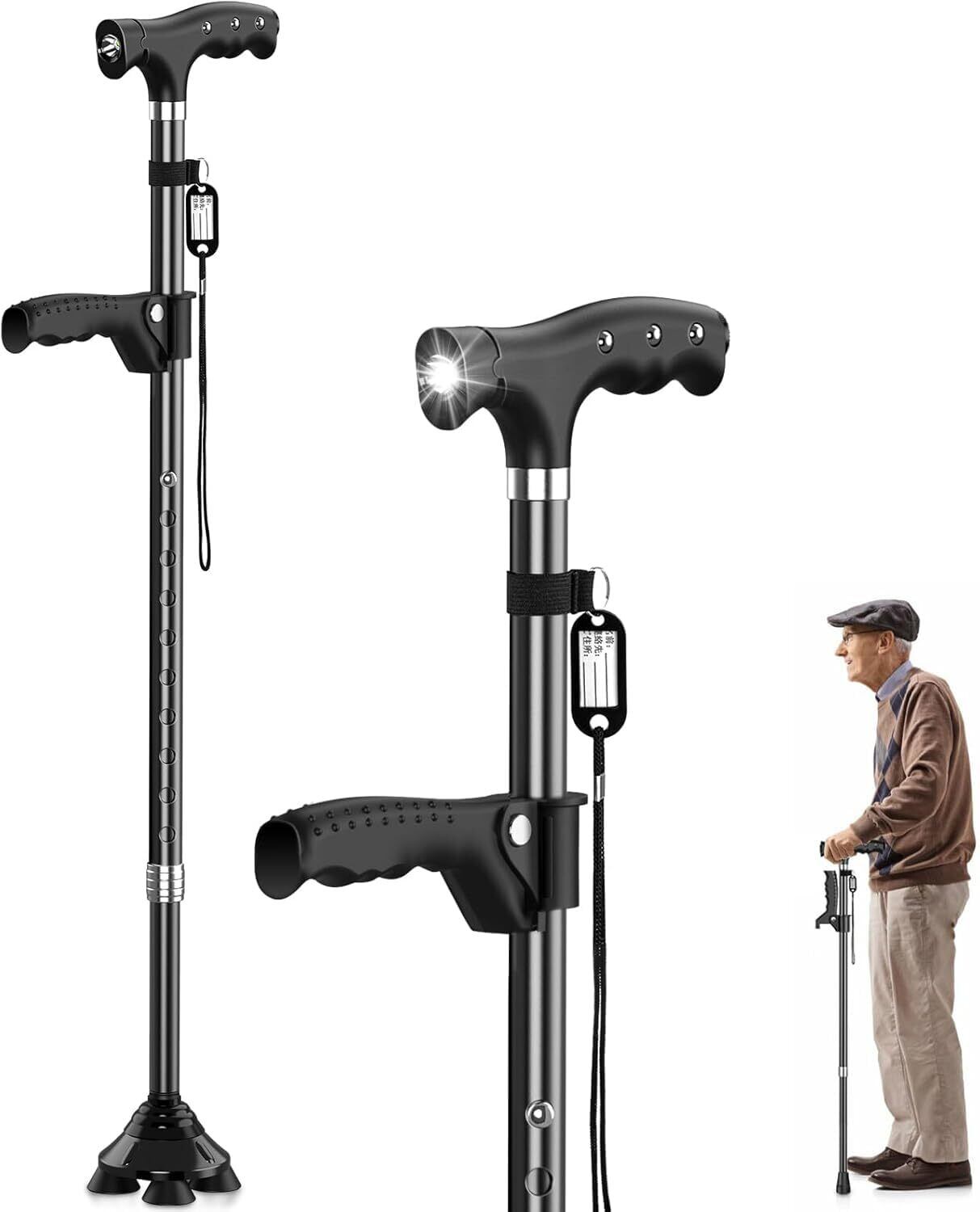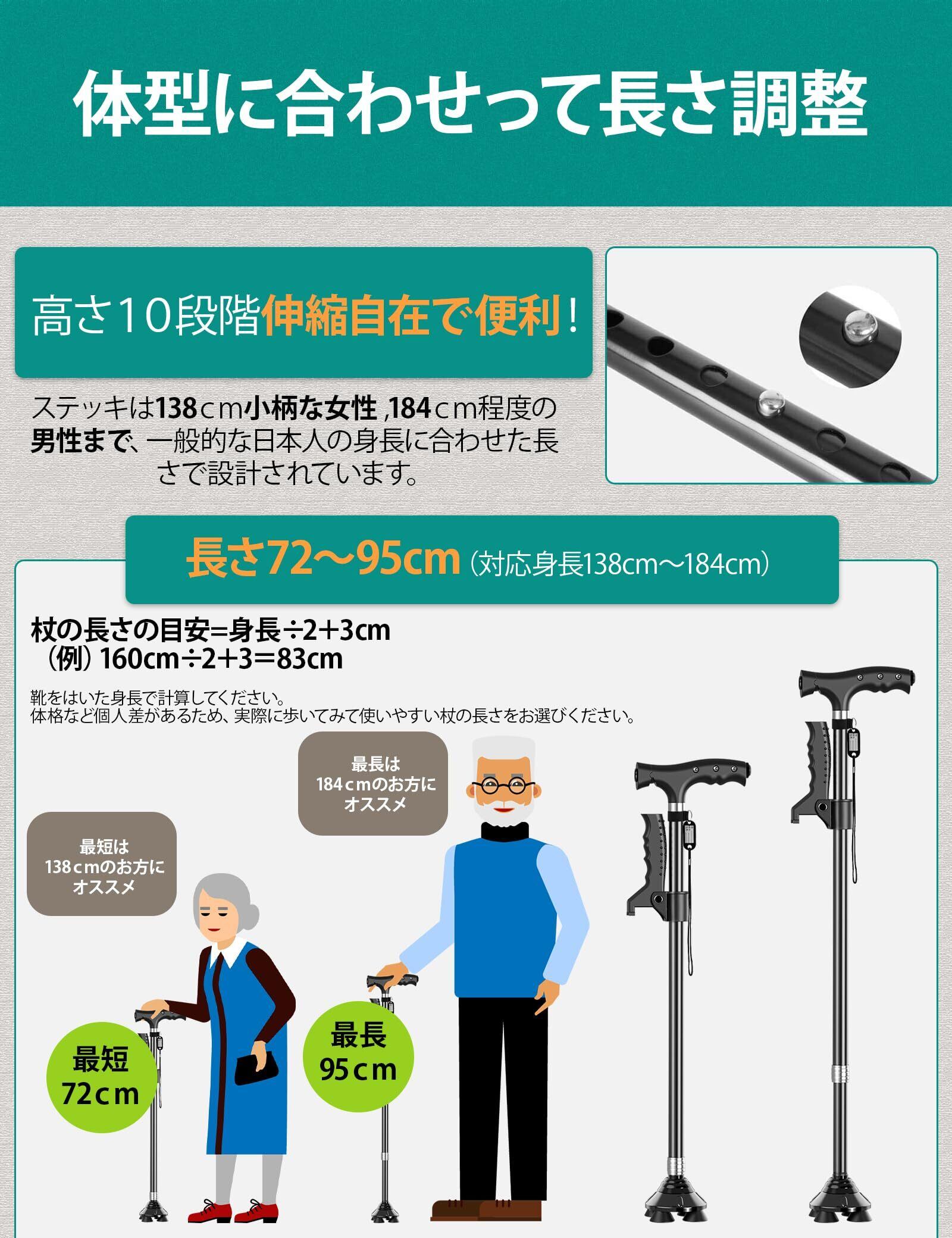 ステッキ 杖 倒れない 自立式4点杖 男女兼用 クレバーケーン伸縮式 軽量アルミ製 長さ調節可能 補助ハンドル付き 介護用 歩行補助杖 LEDライト搭載 夜間散歩対応 日本語説明書付き 高齢者の歩行サポート 松葉杖 敬老の日・母の日・父の日プレゼント 日本語説明書付き ブラック/レッド
