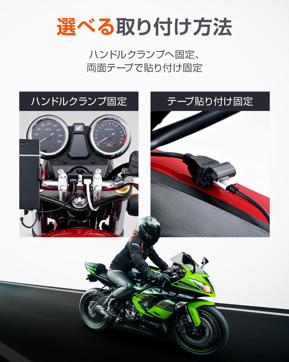 ハンドルクランプ(φ22.2、φ25.4)と貼付式から取付方法を選べます。