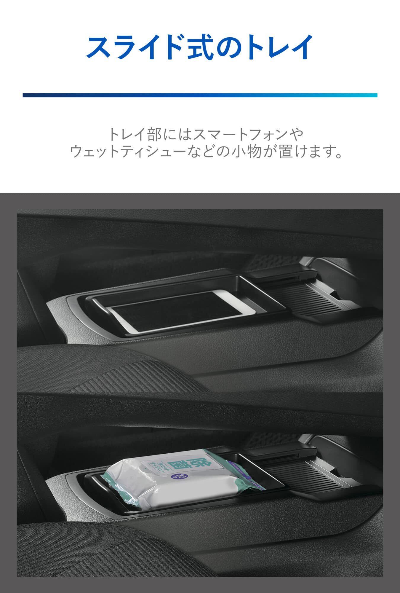 スライド式のトレイはスマートフォンやウェットティシューなどの小物が置けます。コンソール下に小物が置けるため、運転席や助手席から手が届きやすく取り出しやすいです。