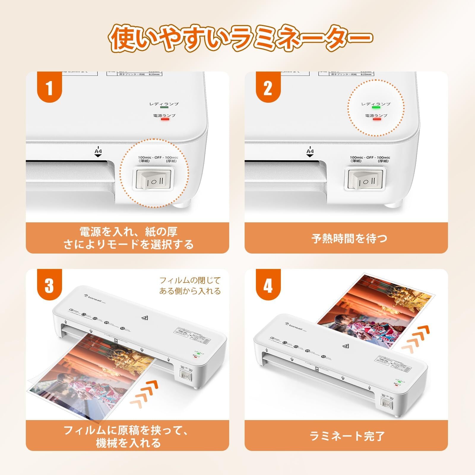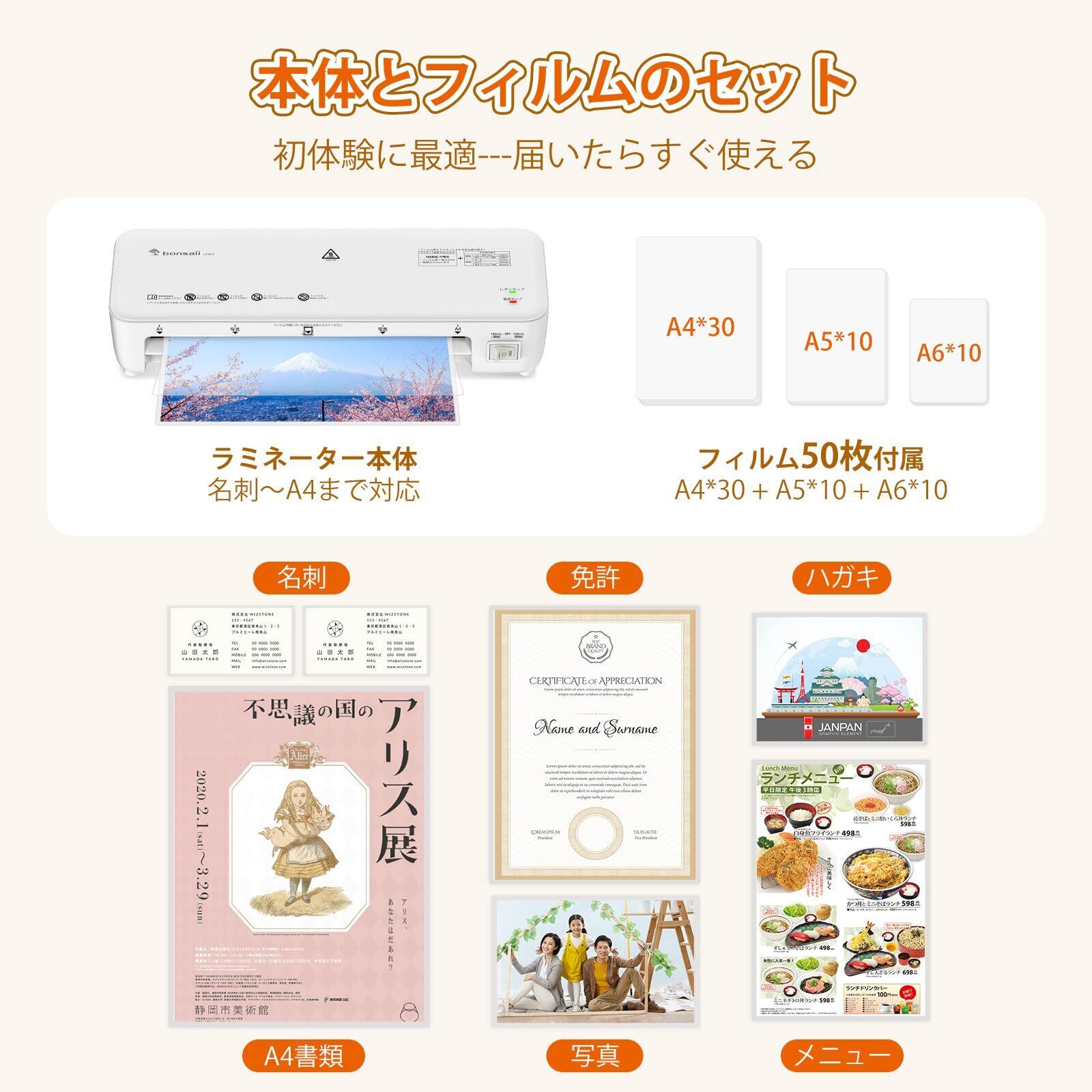 bonsaii ラミネーター a4 50枚フィルム付き 薄紙&厚紙モード付き 100%紙詰まり防止 名刺/カードサイズ対応 波打ち防止 気泡なし ラミネート機械 操作簡単 ホワイト L418-C