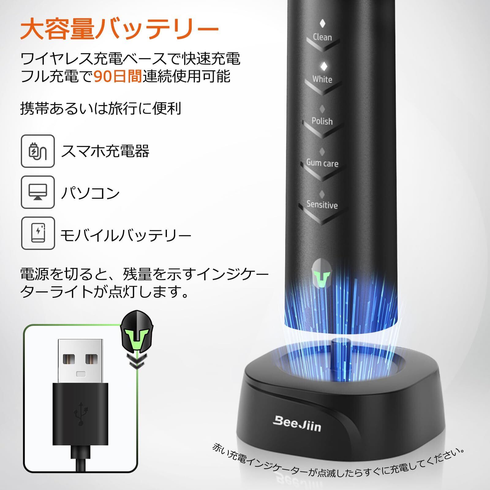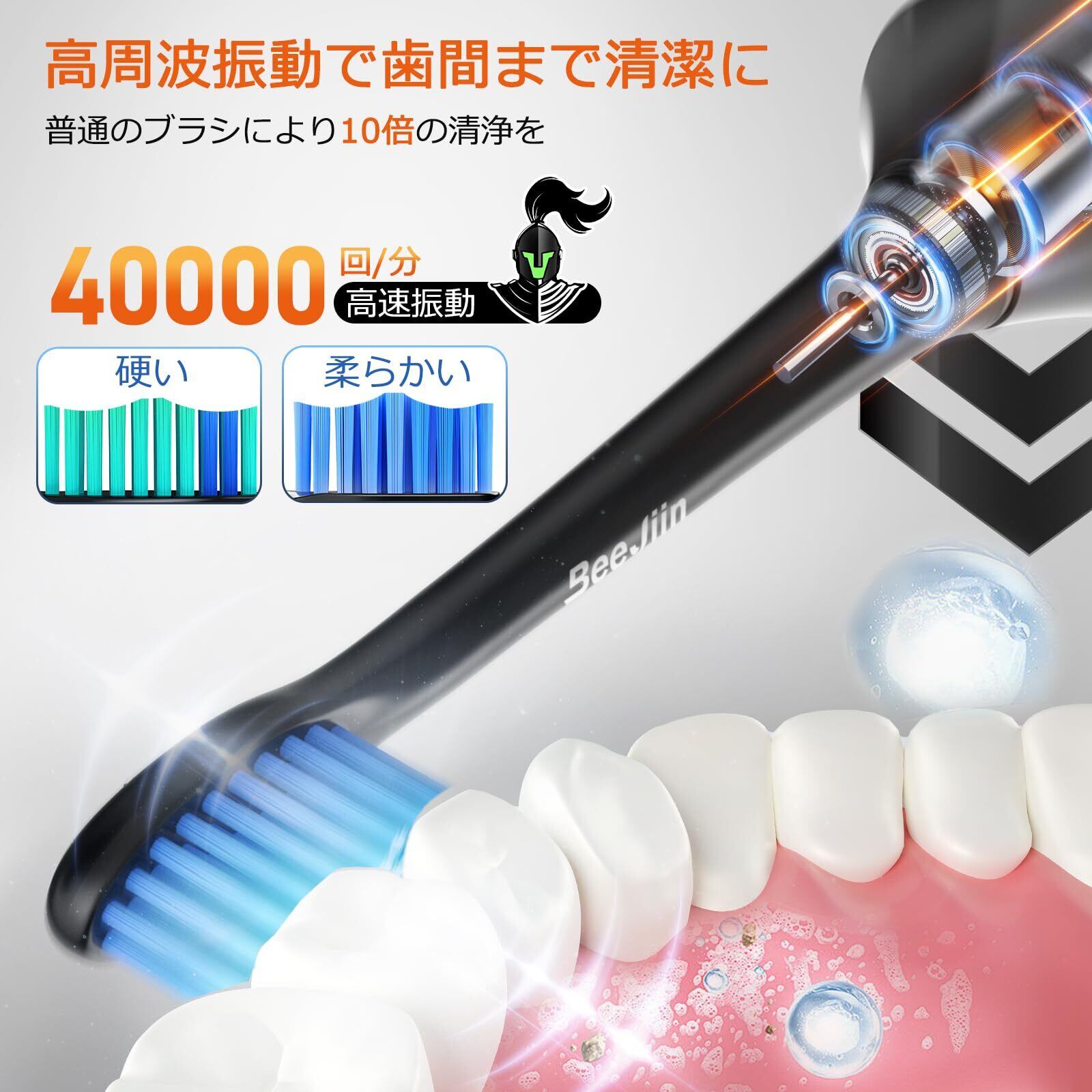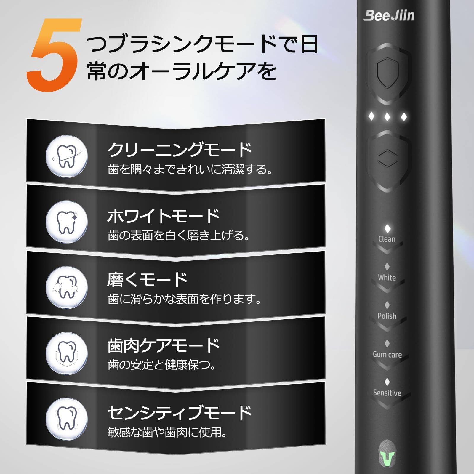 電動歯ブラシ 歯ブラシ Beejiin 音波歯ブラシ ソニック USB充電式 IPX7防水 6本替えブラシ 5つのモード 毎モード3つ強度調節可能 ハブラシ 電動歯ぶらし 電動歯磨き 収納ケース付き 携帯便利 黒
