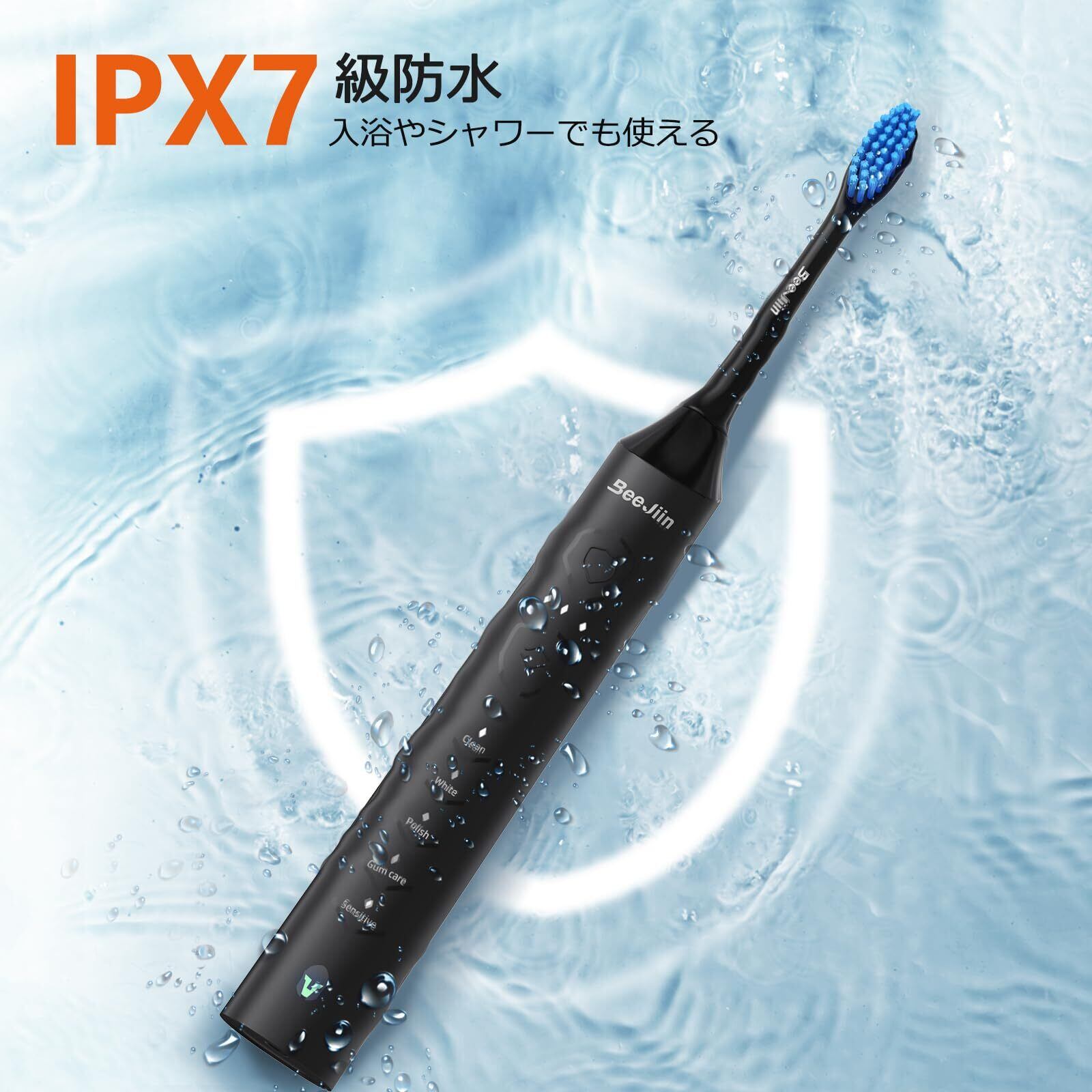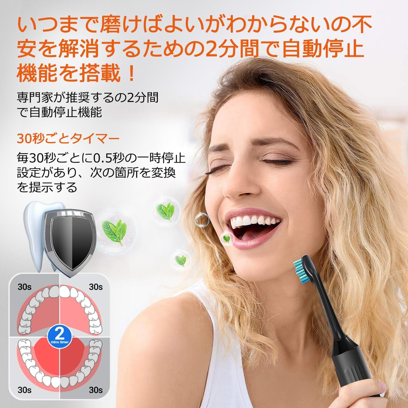 【IPX7級防水性】本機は、IPX7等級の防水性能を備えており、シャワーやお風呂などの湿った環境でも安心して使用できます。また、2分間のタイマーと30秒ごとのインターバルタイマーが搭載されています。2分タイマーは推奨されるブラッシング時間を守るのに役立ち、30秒インターバルタイマーは口内の異なる部分に切り替えることを促し、良好なブラッシング習慣をサポートします。