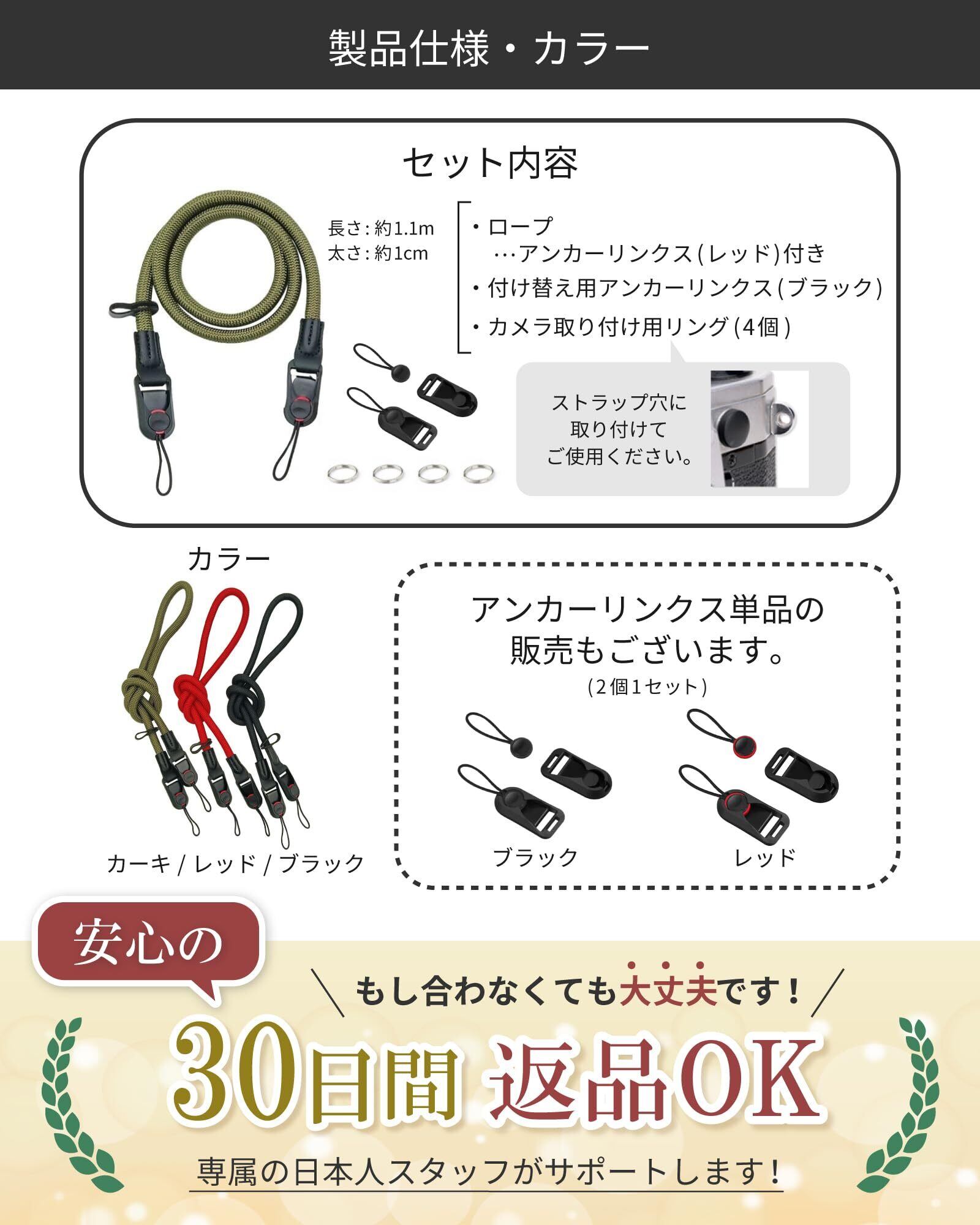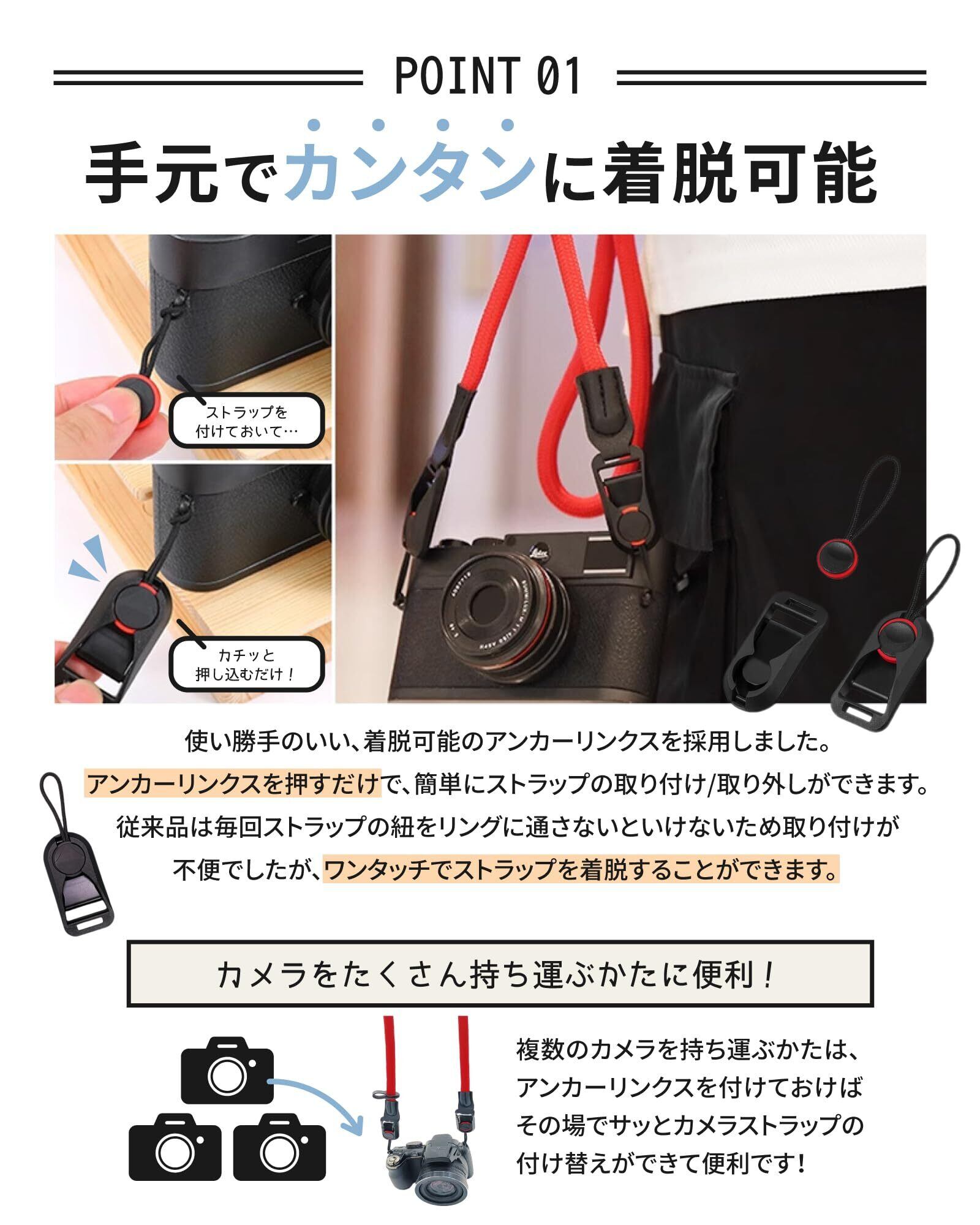 【簡単に取外しができて使いやすい】 ストラップとカメラの接続にアンカーリンクスを採用しております。ワンタッチでも簡単に着脱が可能なので、とても使いやすいカメラストラップです。