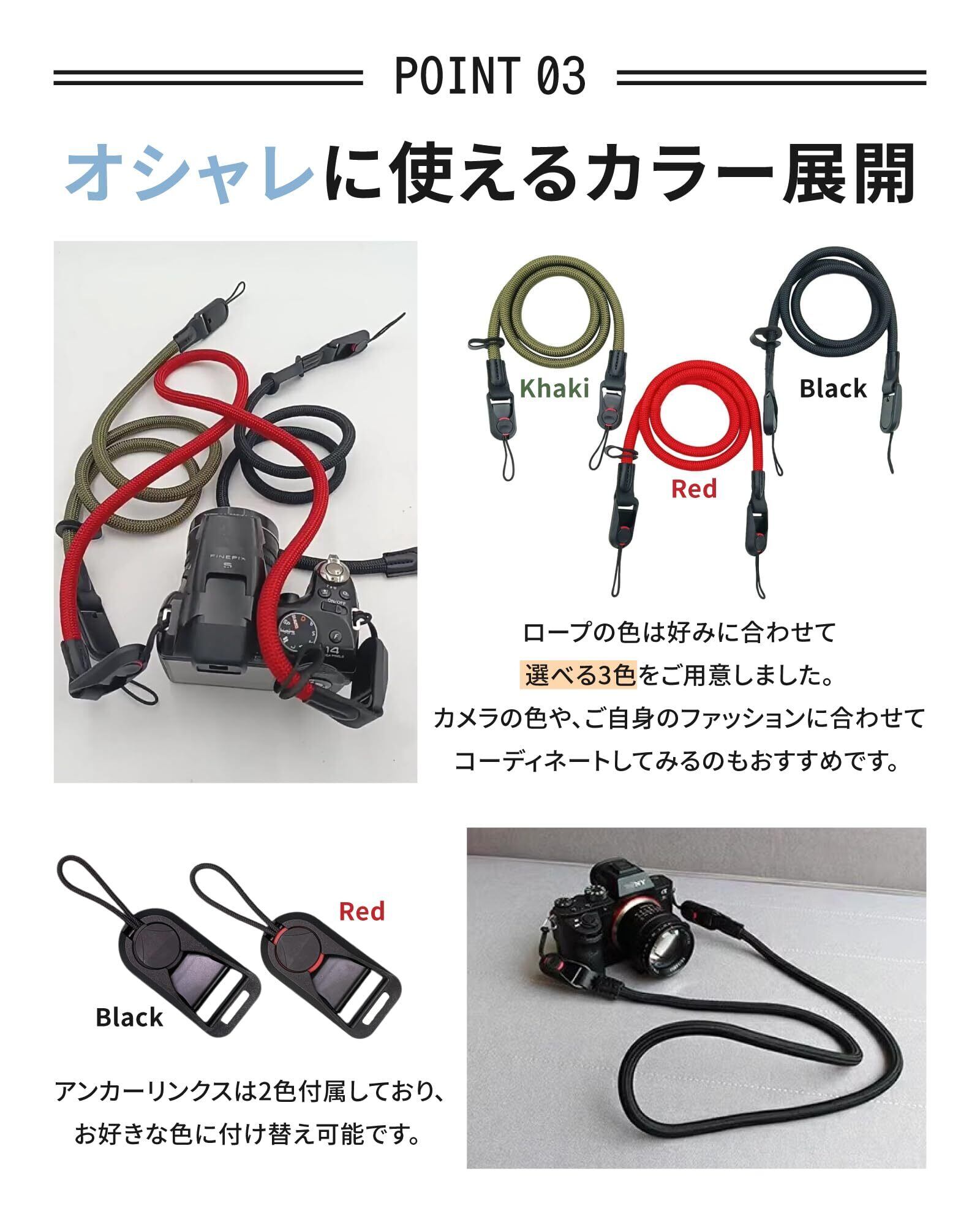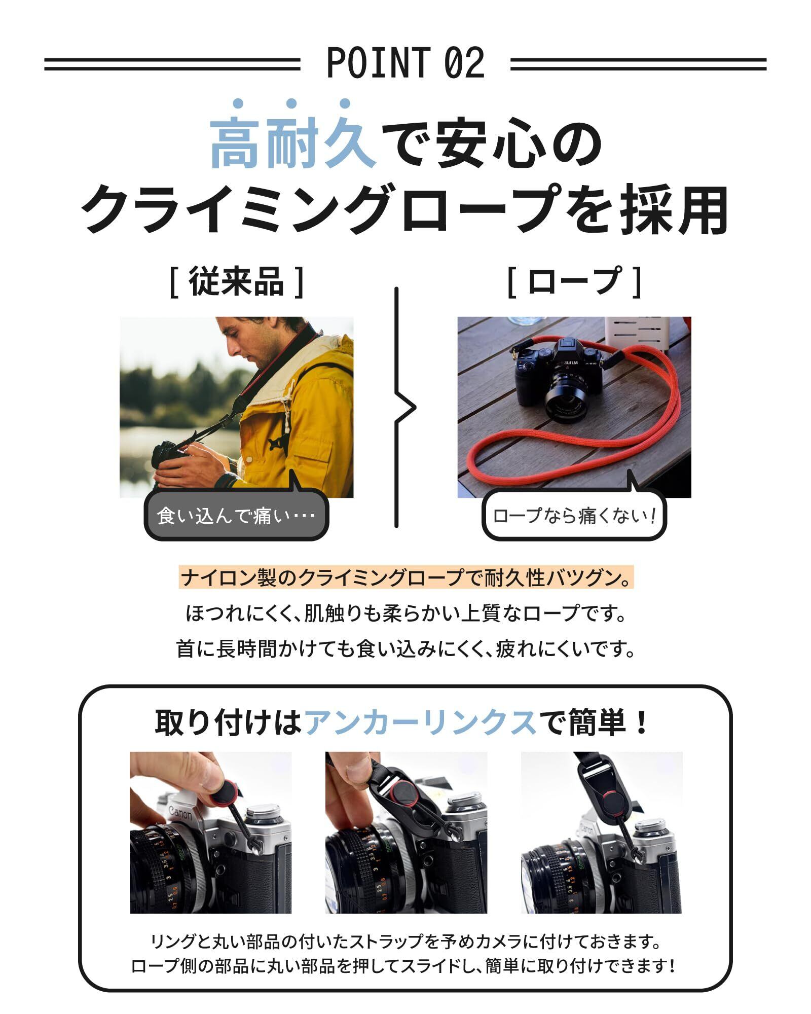 【高品質・高耐久素材】 ストラップには高品質なクライミングロープ素材を採用する事で高い強度を実現しました。摩擦や引っ掛かりにも強く、ハードな使用環境においても長くご使用いただけ、皆様の大切なカメラを落下から防ぎます。
