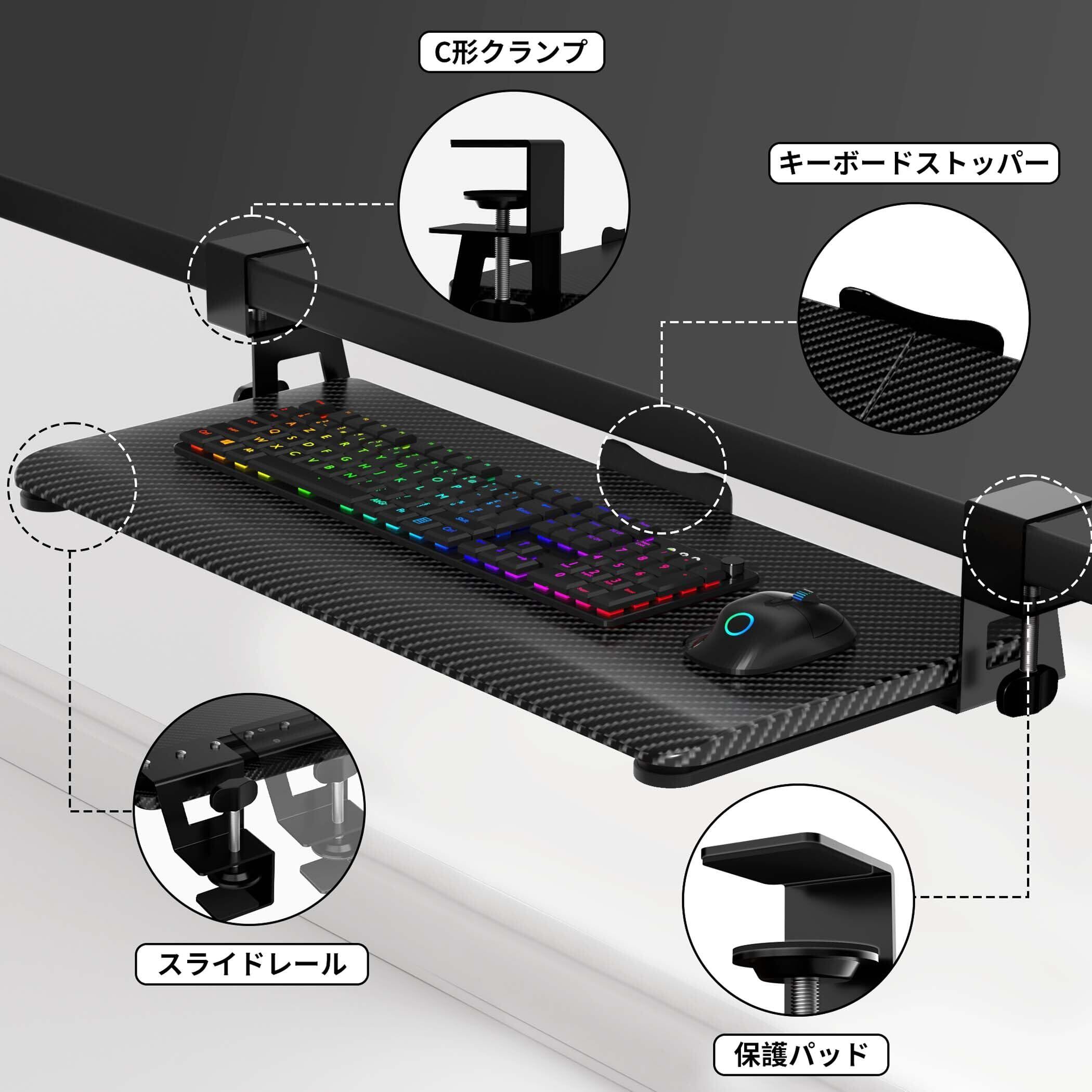 ERGOMAKER キーボードスライダー キーボードトレイ 後付け キーボードスライド式 クランプ式 キーボード引き出し キーボードブリッジ デスク拡張 後付け 机 広げる キーボード収納 マウス収納可能 組立簡単 トレイ幅650*300mm (C形クランプ含めて幅757MM)オフィス/ホーム/学校に適用(カーボンブラック)