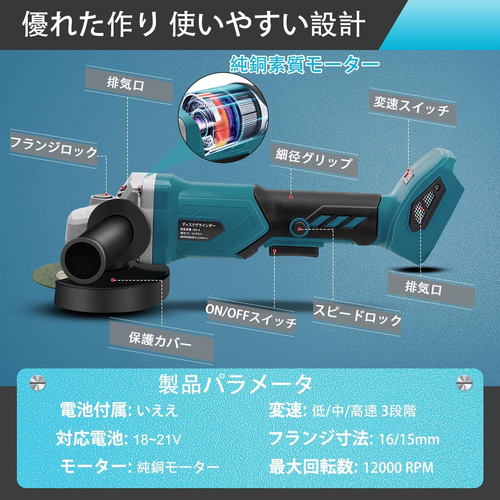 【丁寧で使いやすい設計】 強力な純銅素質モーターを内蔵し、最大回転速度は12000rpm、作業パワと耐久性を増強し、電力消費と動作騒音を低めます。ハンドルは左右方向に取付けます、作業の角度も簡単に変え、手の疲れも配慮しました。コードレスの充電式、持ち運びやすく場所を選ばず、室内/野外作業/工事現場にも簡単に使えます。バッテリー残量を表示ランプがあり、充電のタイミングも分かりやすいです。シャフトロック機能を搭載し、砥石を取り替える部分もしっかりロックして、安心に使えます。