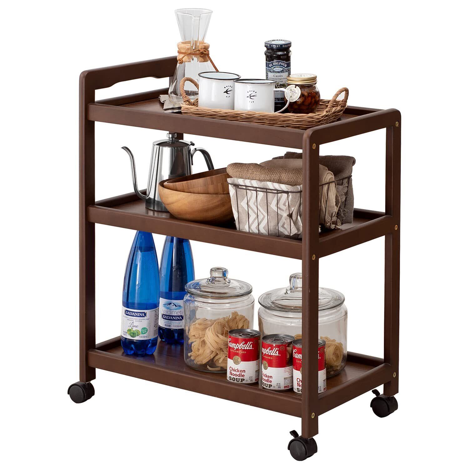萩原 キッチンワゴン 隙間 収納 カート 3段 天然木 耐荷重 15kg 大容量 キャスター 取っ手 付き 幅59 奥行34 高さ72.5 ブラウン VW-7977BR