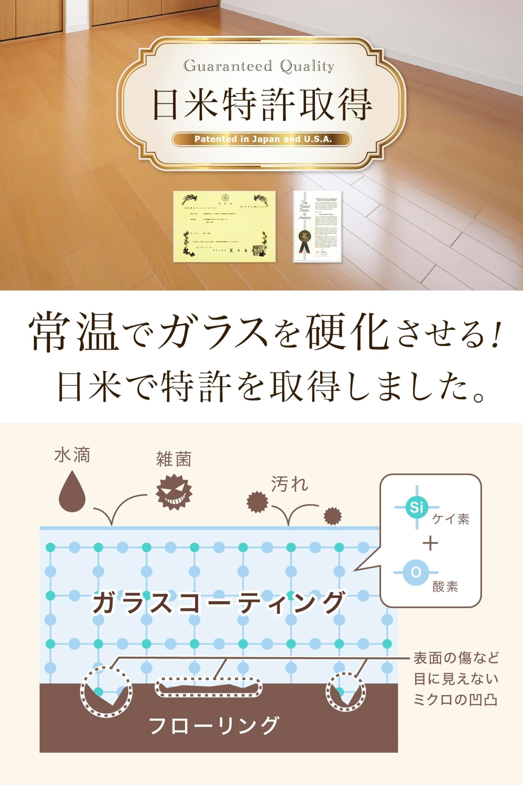【プロ仕様】プロ向けのガラスコーティングを開発研究している企業が、フローリングワックスの代わりになる床コーティング剤を研究開発。品質はそのままに、個人のお客様でも使いやすいものを作りたい!という思いから、乾く時間や手軽さを徹底的に研究。ガラスの硬化を防ぐため、人の手で丁寧に瓶詰めしています。既存の床ワックスとは異なる、高い品質のコーティング剤です。