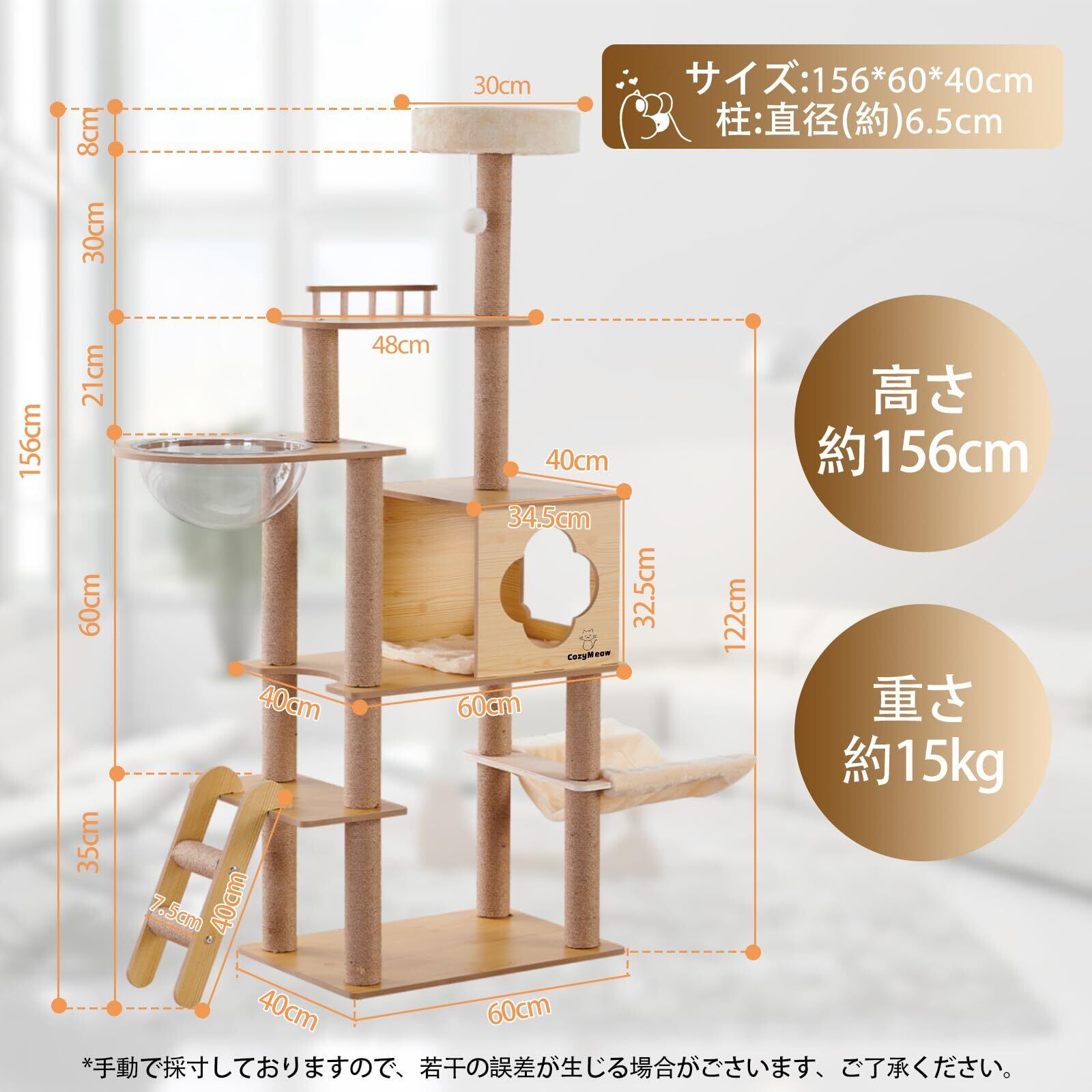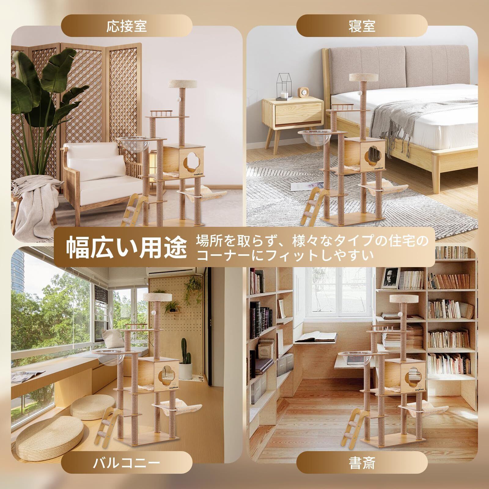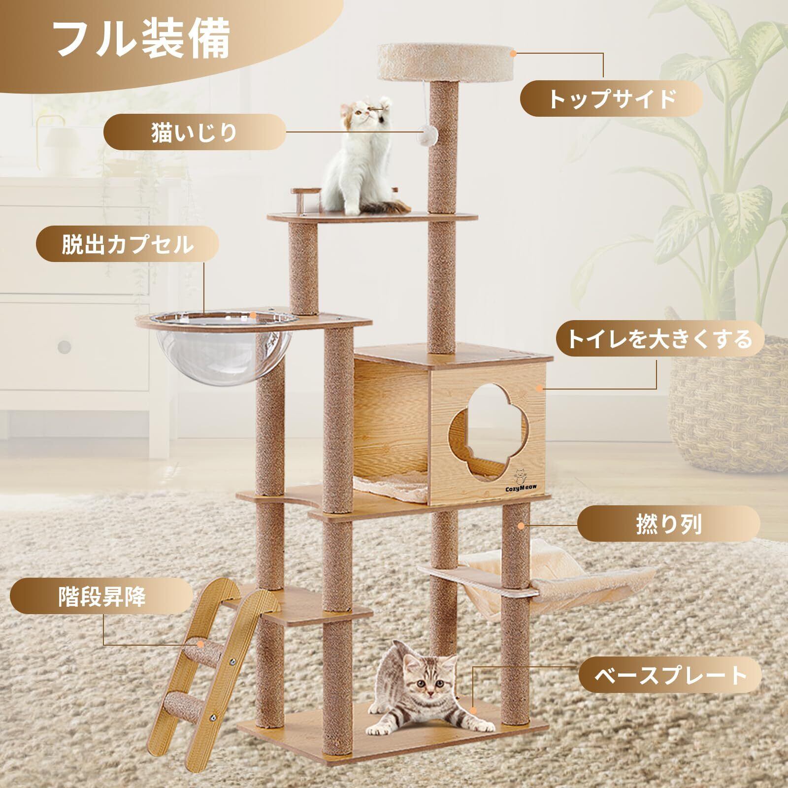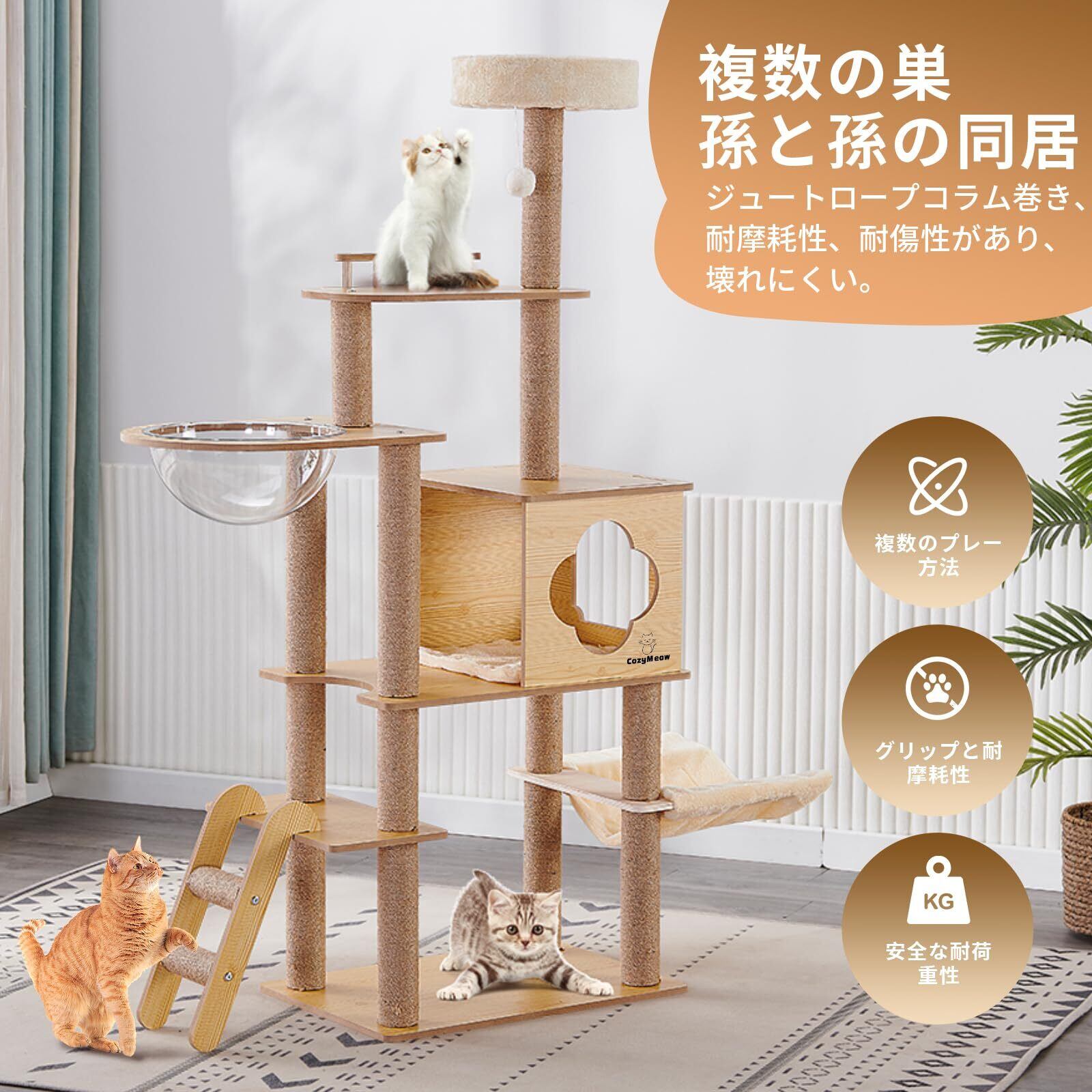 CozyMeow キャットタワー ハンモック 木製 スリムデザイン 大型猫用 老猫や肥満猫、子猫向けキャットハウス 宇宙船型透明ボウル 多頭飼い対応 組み立て簡単 安定性 多段階のステップ 省スペース 天然麻紐の爪とぎ 運動不足解消 高さ約156cm 日本語説明書付き(木製タイプM3)